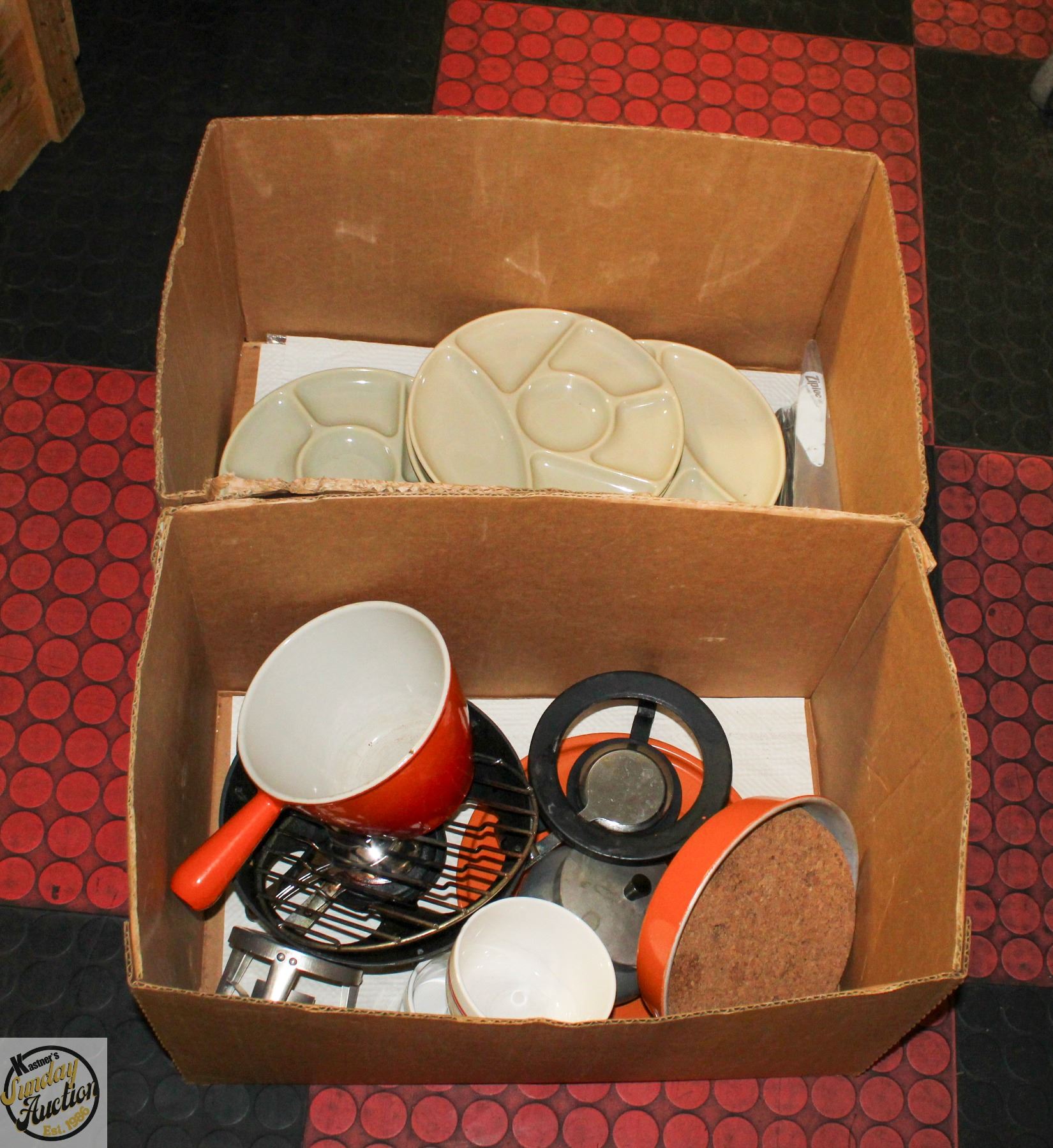FONDUE PLATES AND FORKS + THREE FONDUE POTS