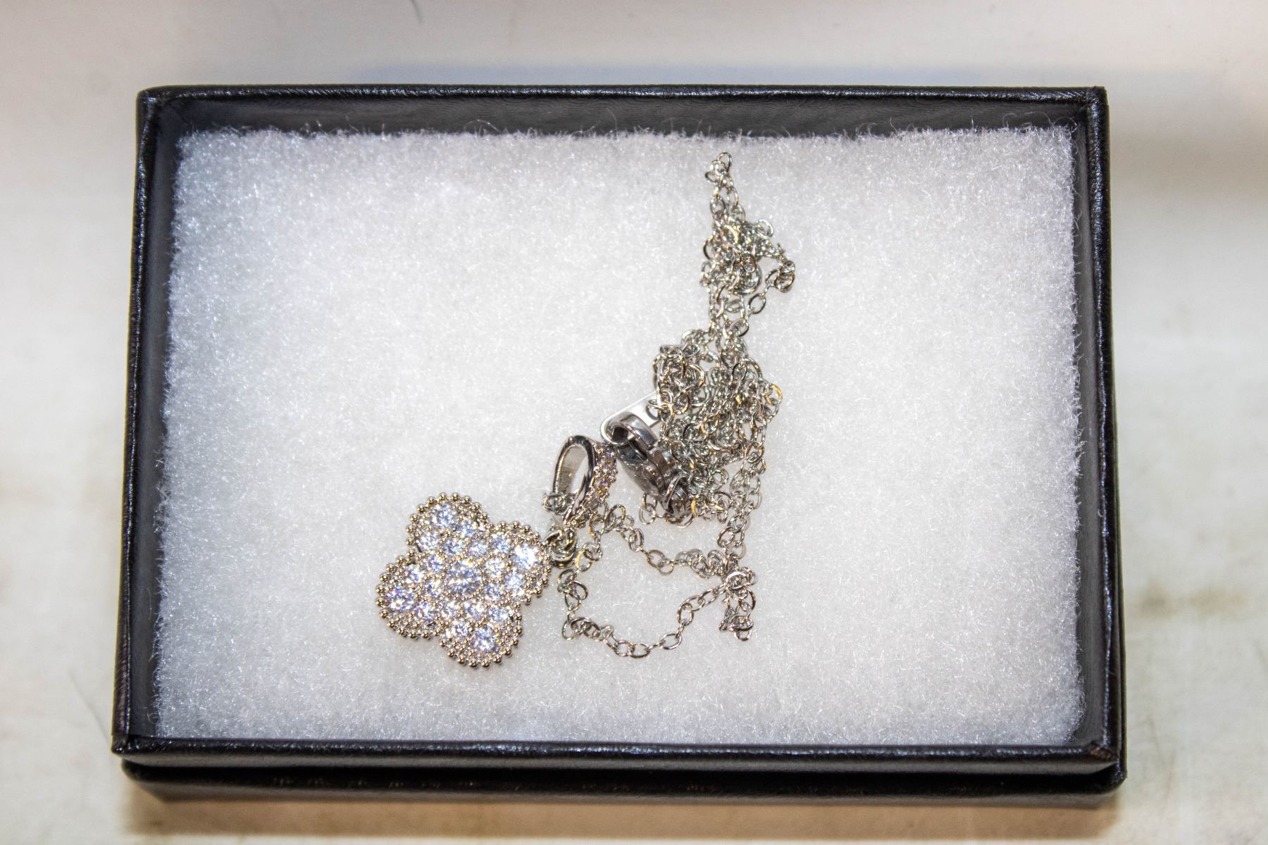 WITH PAVÉ CRYSTALS. IT IS SET ON A DELICATE SILVER-TONED CHAIN IN BOX
