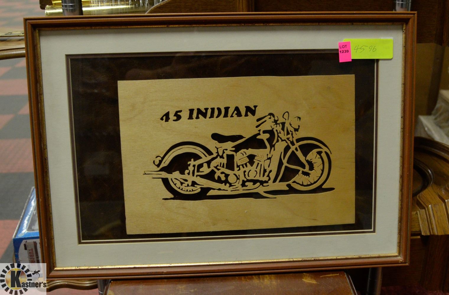 FRAMED WOOD 45 INDIAN MOTERCYCLE PICTURE