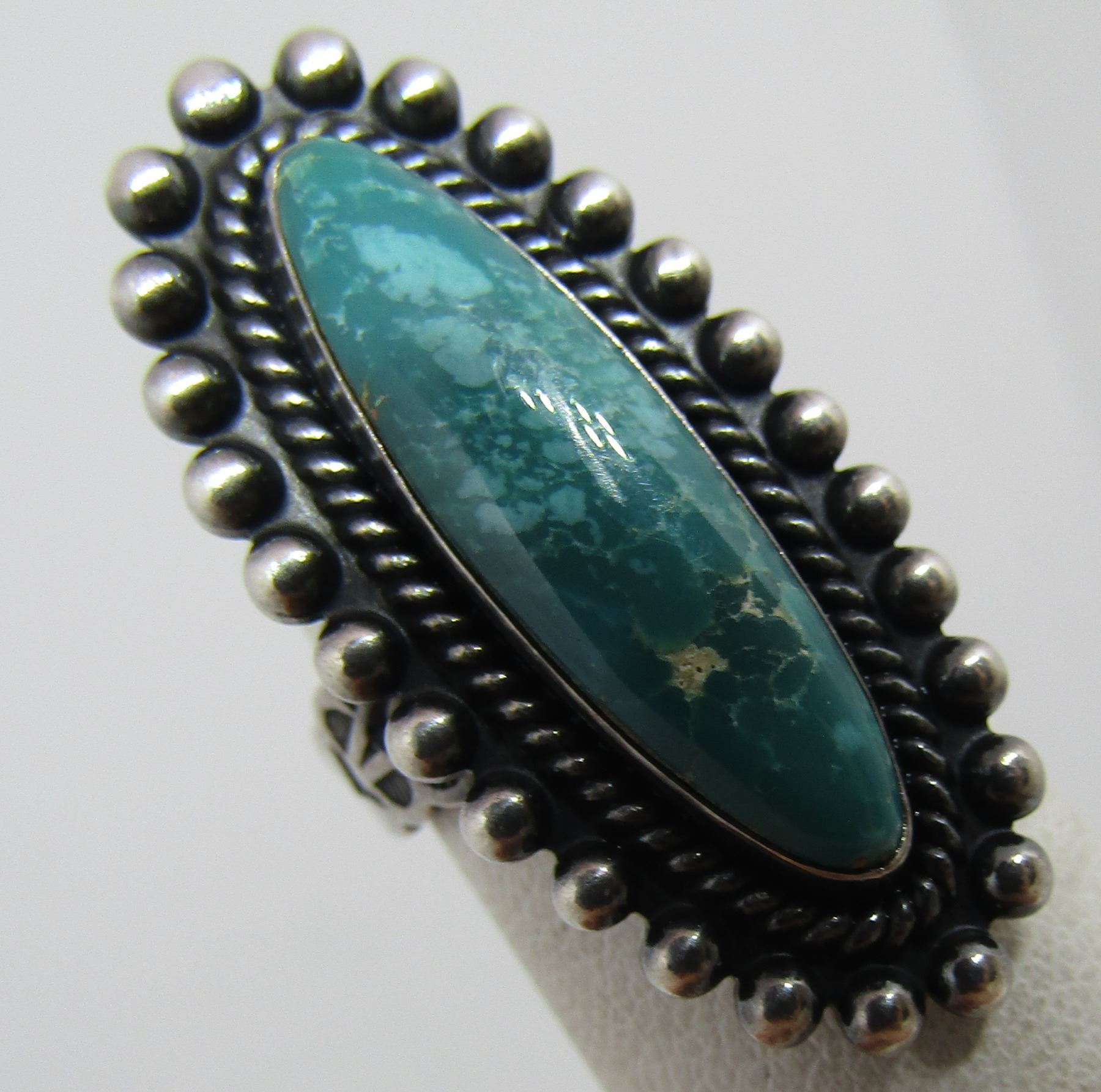 HALLMARKED "STERLING" VINTAGE ESTATE NATIVE AMERICAN SOUTHWEST INDIAN JEWELRY. BEZEL MOUNTED WITH GEM SPIDER WEB TURQUOISE. TOP MEASURES 15MM WIDE BY 32MM LONG.. WEIGH 6.5 GRAMS. SIZE 4.5. USA SHIPPING $5.