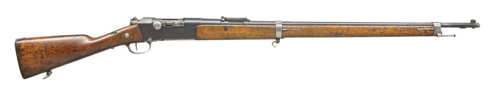 MILITARY RIFLE. Cal. 8mm Lebel. S# 83443. Bbl. 31 1/2". All visible numbers match. Rifle marked on left side of receiver "MANUFACTURE D'ARMES TULLE" "MLE 1886 M93". Bbl. is marked over chamber on top left w/ "F" "(encircled) A" "D". Marked on right side is "M A T" "1899". Straight bolt handle. Ladder rear sight graduated to 2,300 meters. Blade front sight, stacking bar & bayonet mount are present. Walnut stock forend. Buttstock is marked on right side w/ illegible circular property mark. CONDITION: stock set has well worn appearance w/ scratches, staining & handling marks w/ thinning finish. Metal has 50% worn original blue turning gray w/ scattered handling marks. Dark oxidized bore w/ worn lands. (22-632/RW). CURIO. $400-600.