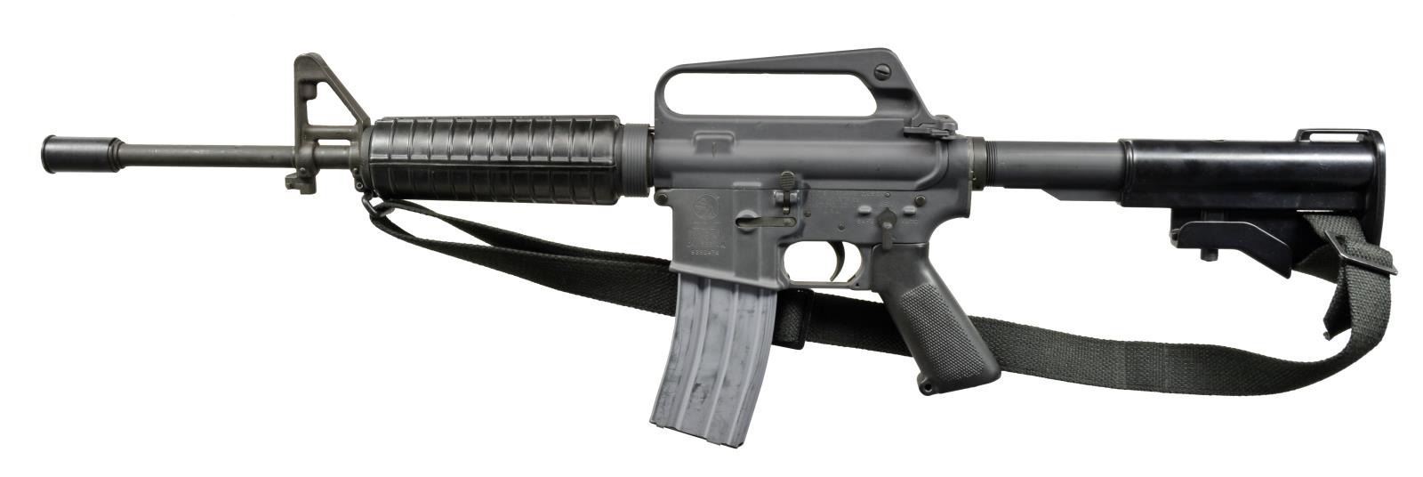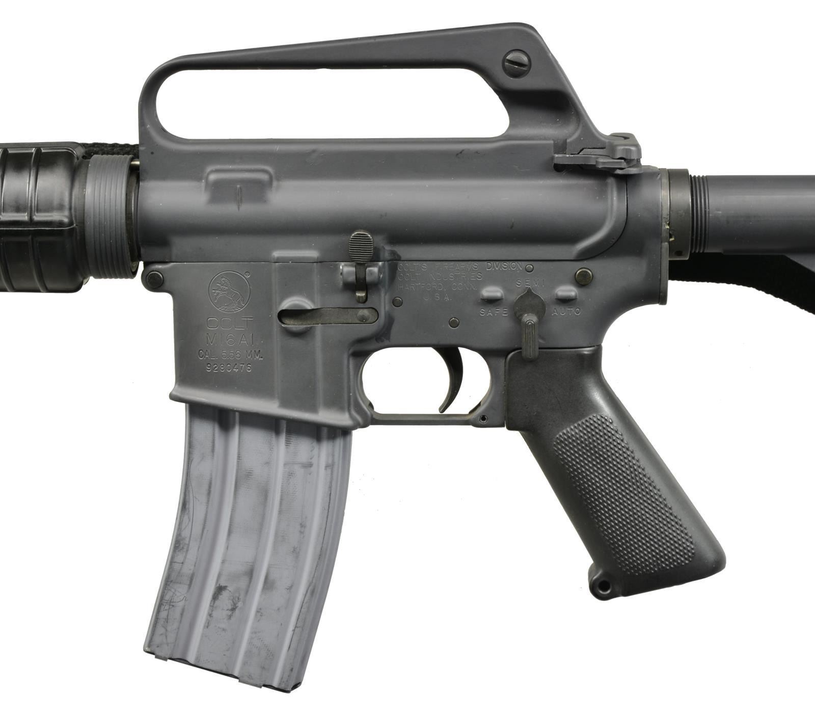 Cal. 5.56. S# 9280476. Bbl. 14 1/2". Colt M16 A1 carbine as indicated on original form 4. Very few firearms are as recognizable & relevant as the Colt M16. From 40 year old black & white grainy news clips to current high definition video, shot in the Middle East, this time proven workhorse still remains the primary longarm today. Its semi-auto, sporting counterpart, the AR15, has been the most popular MSR in the U.S. for over a decade. Unfortunately, it’s been over 34 years since these could be manufactured for civilian ownership, making this significant find that much more desirable. This gun includes the holy grail of provenance in the form of the original bill of lading from Colt dated 05/07/79, indicating manufacture as a model RO 653 in carbine configuration. A2 style flash hider protected post elevation adj. front sight w/ bayonet lug & windage adj. rear peep. Straight Delta ring. Teardrop forward assist. Raised fence lower receiver. No brass deflector. Factory black anodized finish. Sling swivels front & rear w/ black canvas sling. Aluminum 2 position collapsible stock w/ factory dark black finish. Receiver markings are as follows: left side, Colt pony logo on mag. well “COLT / M16 A1 / CAL. 5.56MM. / 9280476”, above trigger “COLT’S FIREARMS DIVISION / COLT INDUSTRIES / HARTFORD, CONN. / U.S.A.”, safety selector markings “SAFE-SEMI-AUTO”. Upper receiver marked “C H” below rear sight, bbl. marked “C MP B”. MAGS: 1 aluminum 30 rd. UNATTACHED ACCESSORIES: booklets and manuals regarding M16A1, including FM 23-9 M16A1 Rifle and Rifle Marksmanship dated 1974, Dept of Army technical manual, operation and preventive maintenance booklet, Oct. 1998 dated Dept. of Army operation manual, Feb. 1985 Dept of Army operation manual & the original 1979 commercial Colt operator's manual as provided w/ the rifle. Original bill of lading from Colt & factory shipping box as delivered to original buyer indicated on the bill of lading. CONDITION: shiny bore w/ strong rifling. Exterior finish indicative of very little use outside of range activities. Only light handling marks which is consistent w/ safe stored long guns. Fire control mechanism appears to function correctly when cycled by hand. NATIONAL FIREARMS ACT SMG REQUIRING BATF TRANSFER BEFORE TAKING POSSESSION. FULLY TRANSFERABLE. (03-1487/JZ). MODERN CLASS III. $14,000-18,000.