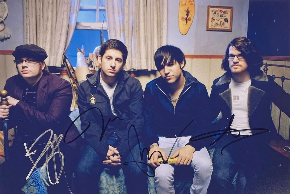 Fall Out Boy band facsimile facsimile signed photo autographed by Patrick Stump, Joe Trohman, Pete Wentz and Andy Hurley. 8x10 inches. This item is a reprint of an original autograph