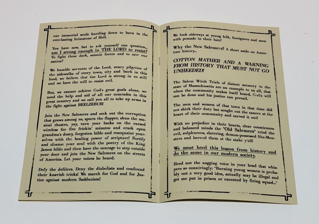 Original "Witches Live Among Us!" pamphlet flyer given out by Mary Lou (Samantha Morton), from the fantasy film 'Fantastic Beasts and Where to Find Them' (2016), the spin-off and prequel to the Harry Potter film series, the adventures of writer Newt Scamander in New York's secret community of witches and wizards seventy years before Harry Potter reads his book in school.