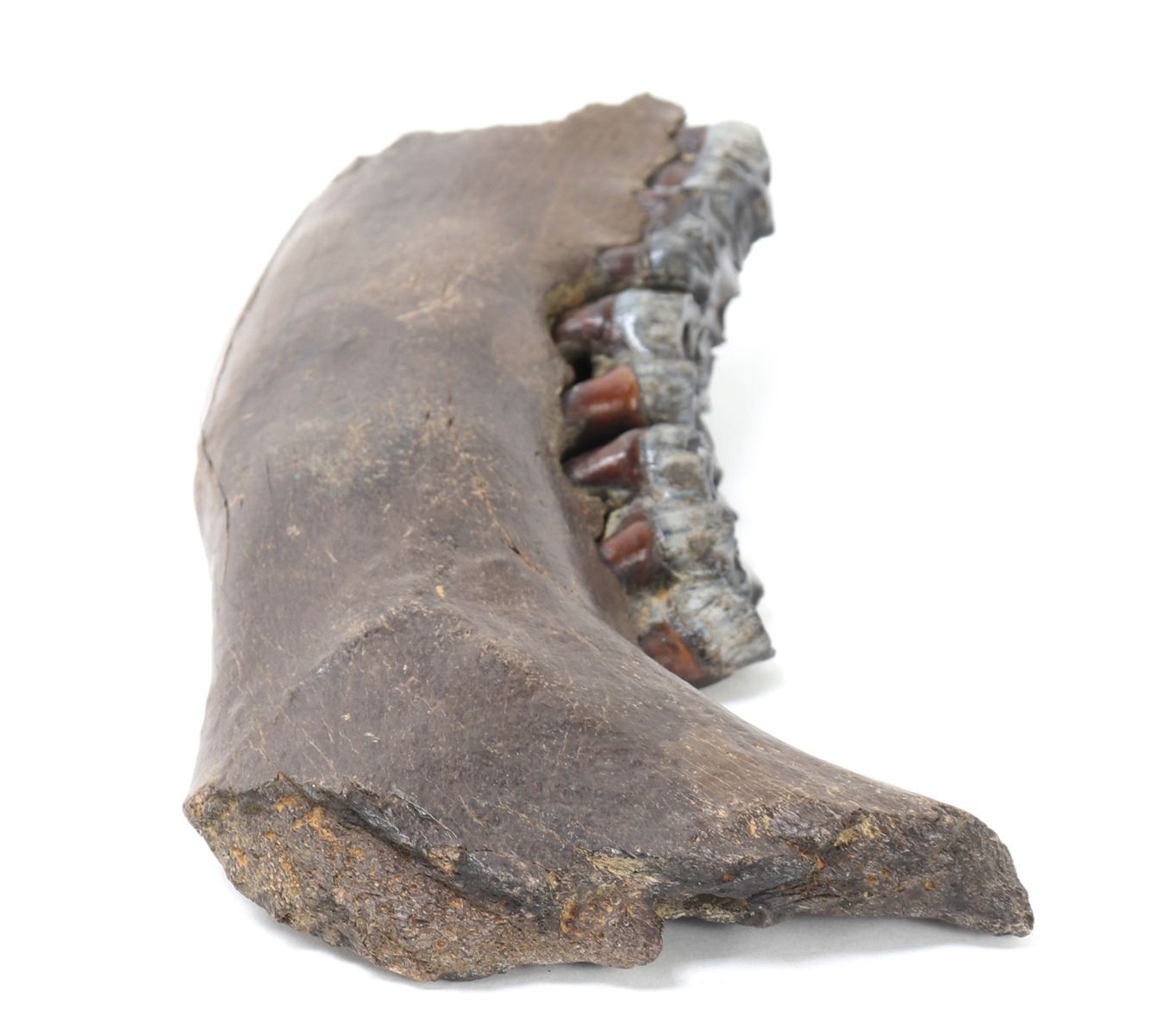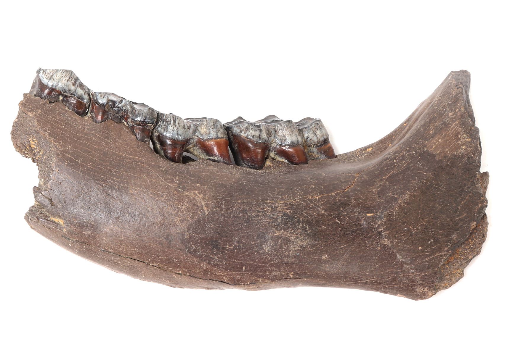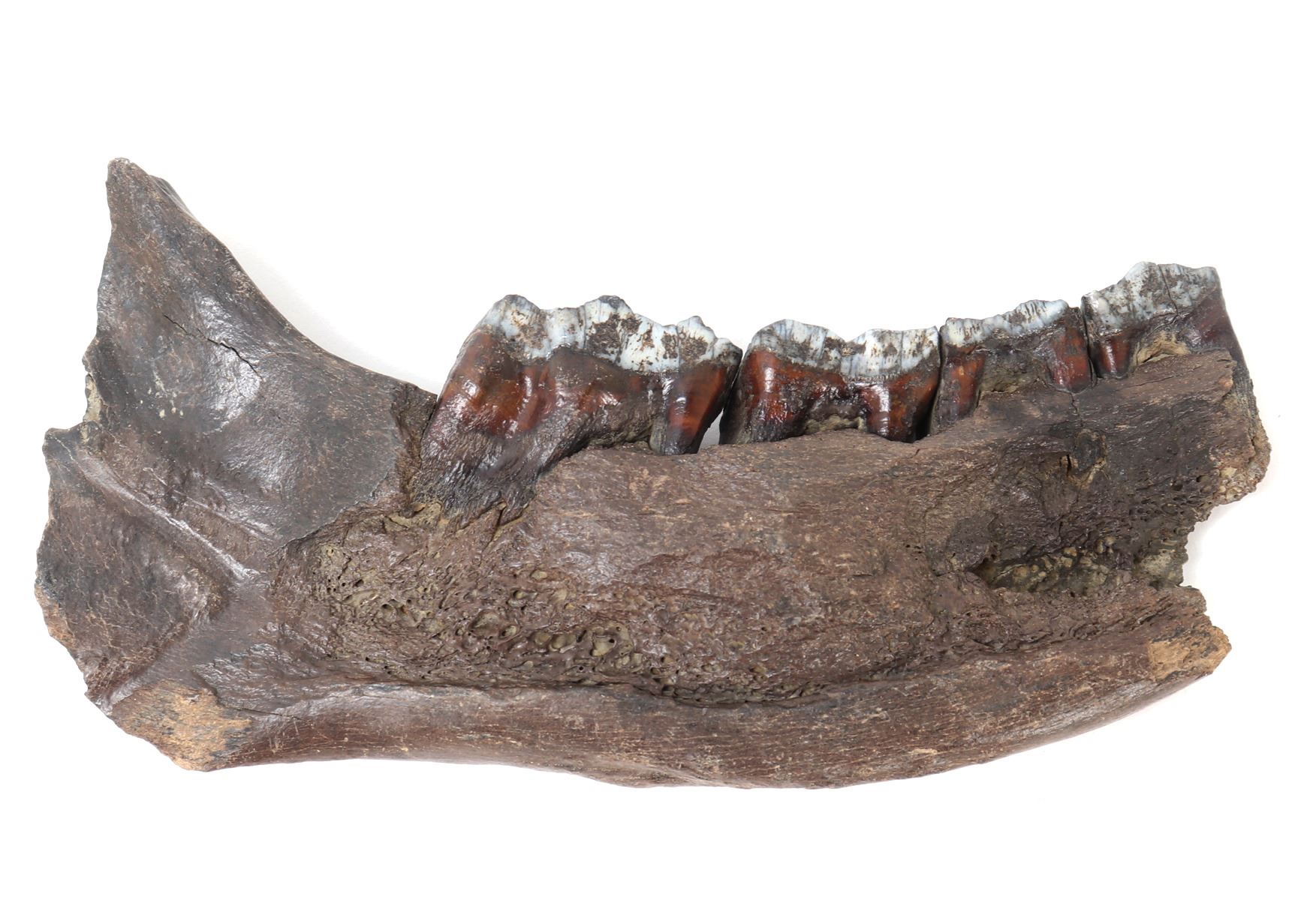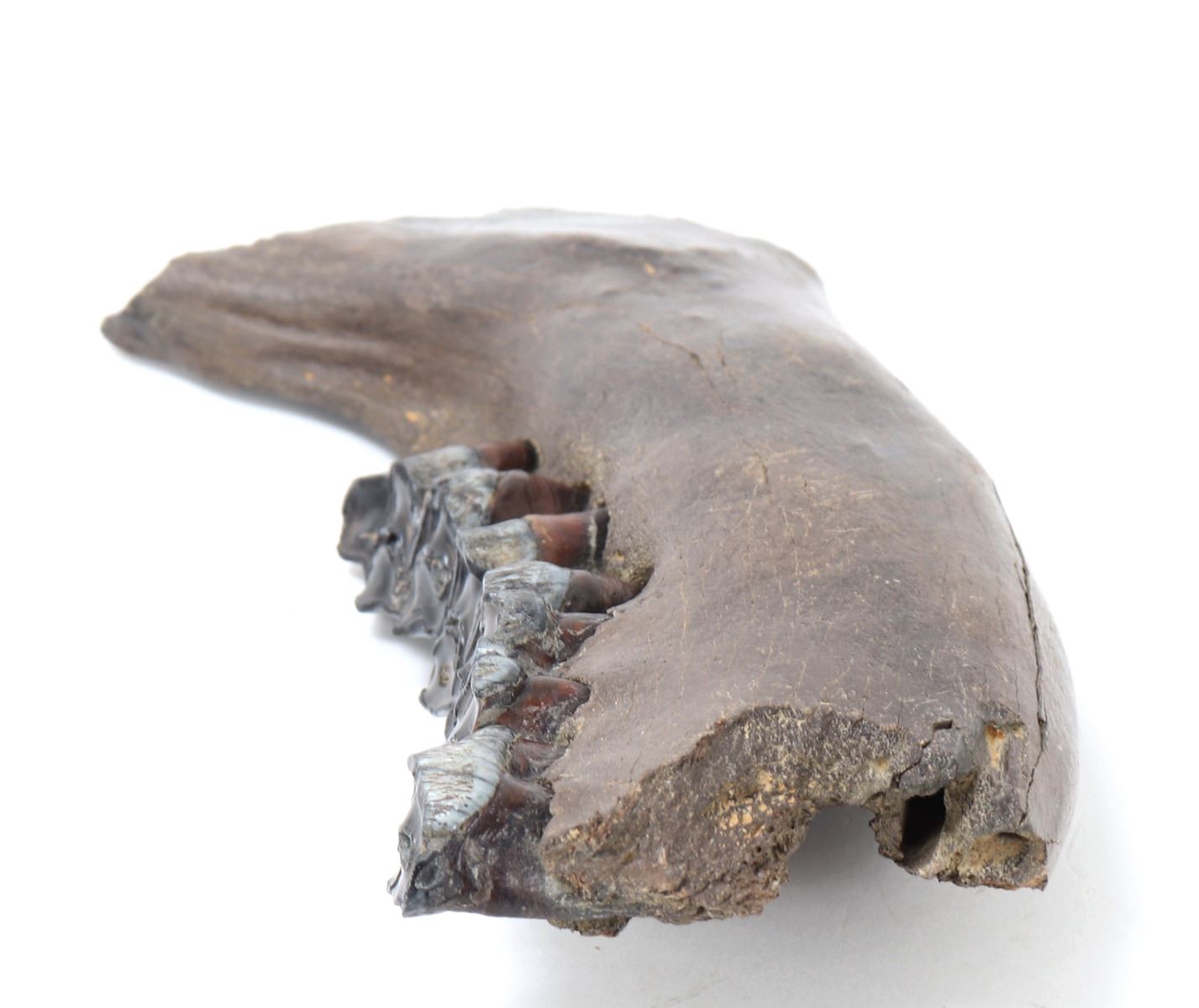 Wonderfully preserved ancient extinct woolly mammoth jaw section with incredibly preserved teeth remaining. Beautiful aged patina throughout with some pitting. Four teeth remain well preserved in the jaw. Size 7 1/4" L. Condition: Well preserved condition.