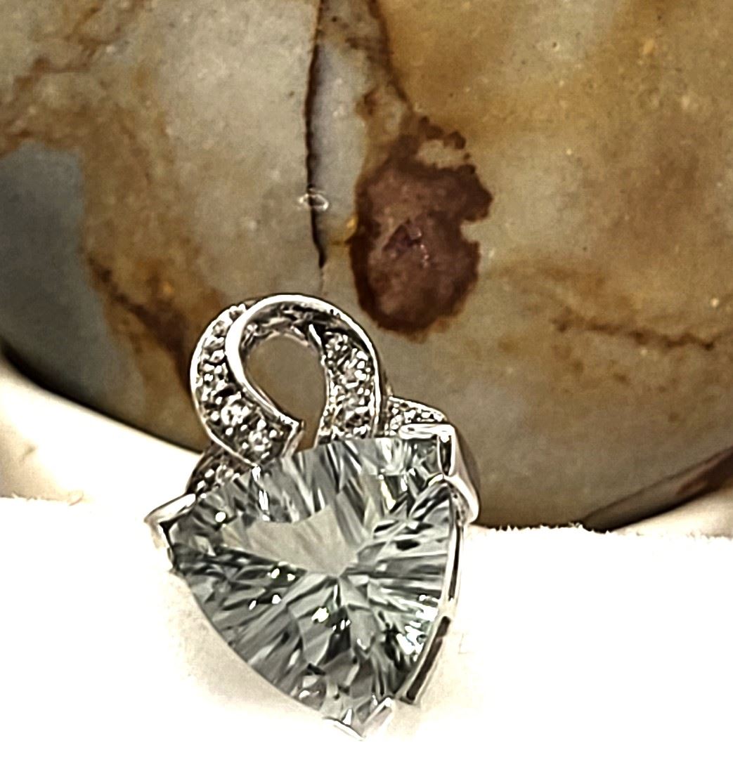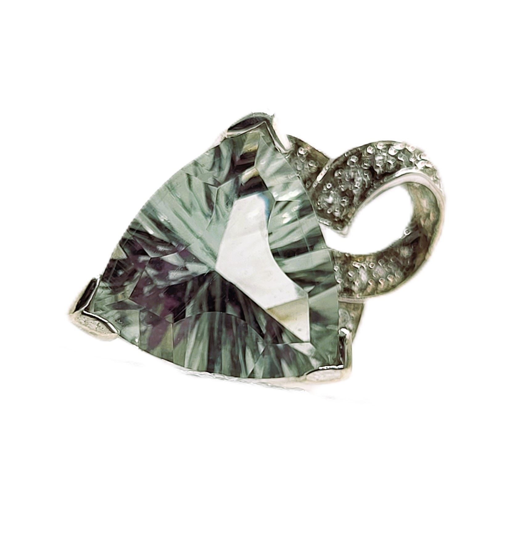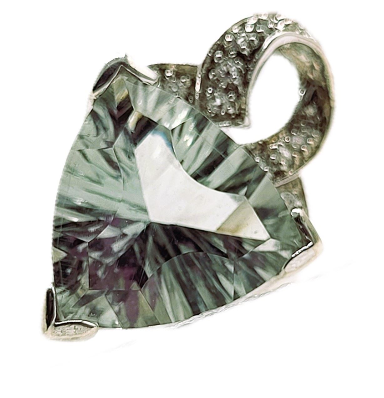 This sterling silver pendant features an approximate 4.00 carat fantasy-cut Prasiolite. This specialty gemstone has a sunburst pavilion and a scalloped table/girdle area.& nbsp; It is set with V-prongs. The fancy built-in bail is accented with clear quartz and can accommodate an approximate 4mm wide chain.& nbsp; Admin: 33121/12g