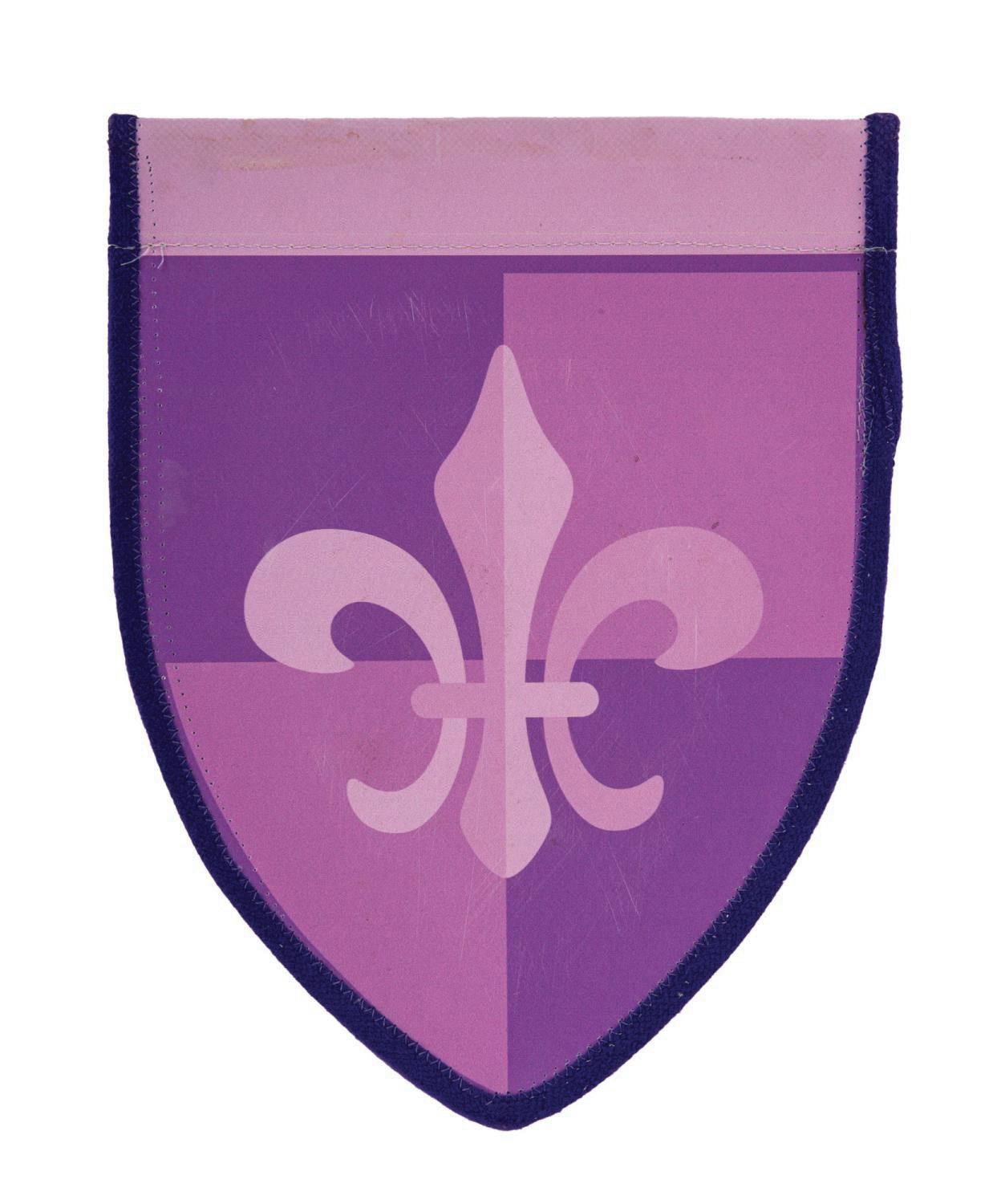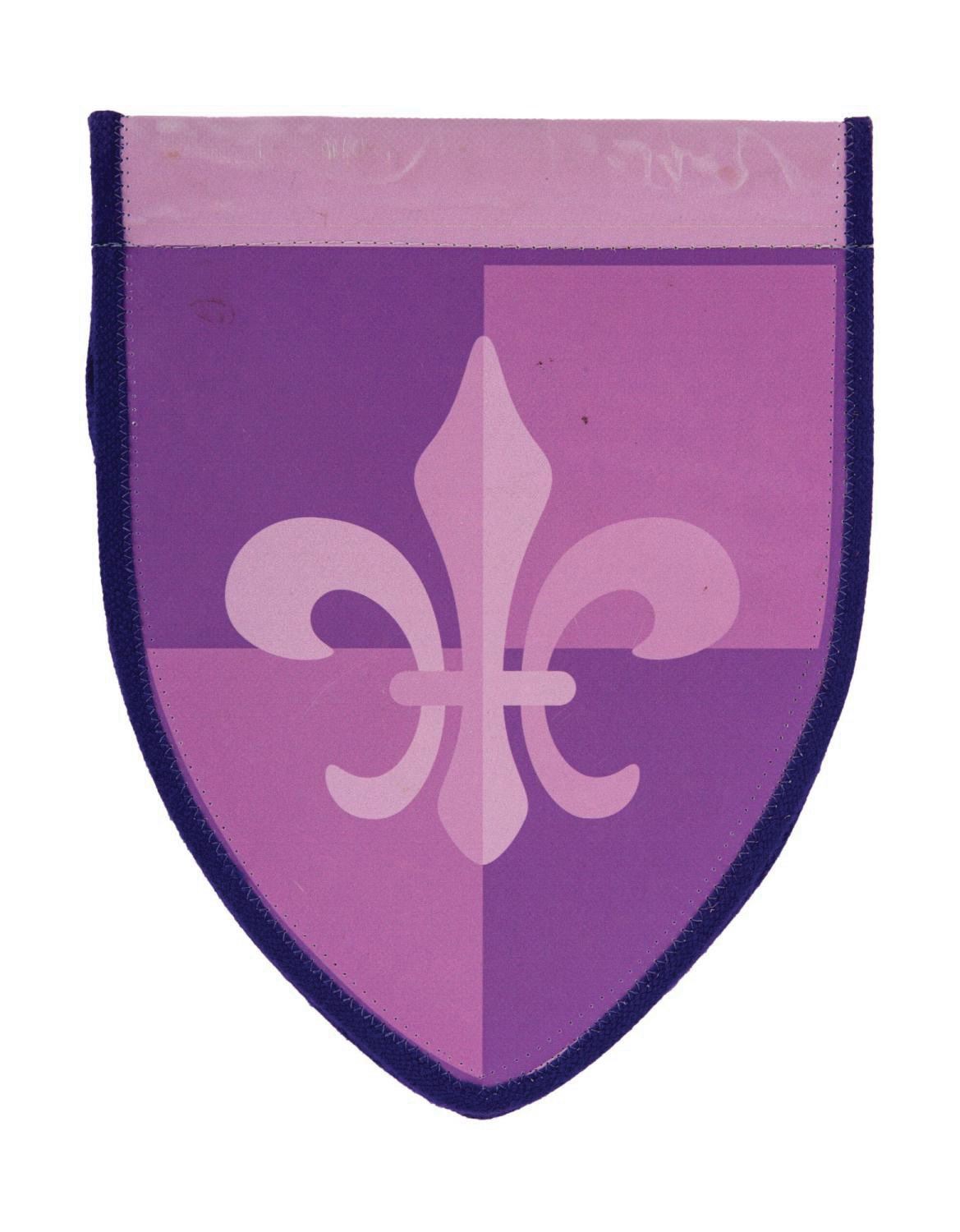 (Disneyland, c.2010s) A crowd control pennant flag that adorned the ropes of Fantasyland queues. The purple shield-shaped pennon is decorated with Fleur-de-lis on both sides. Constructed of cloth and vinyl, the flag is equipped with a sleeve at top to run a rope through and features. Measuring 13"x10", the piece is in very good condition with only minor wear.