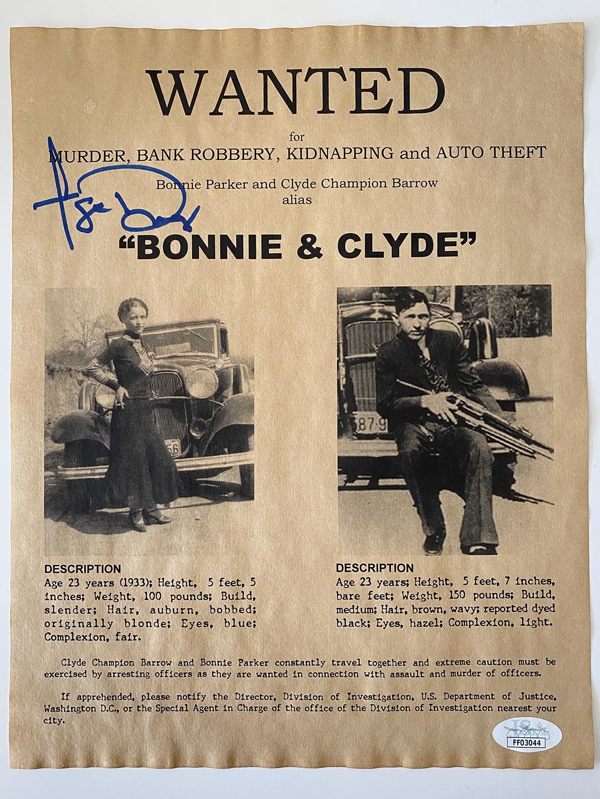 Faye Dunaway signed "Bonnie and Clyde" photo.JSA authenticated.8x11 inches