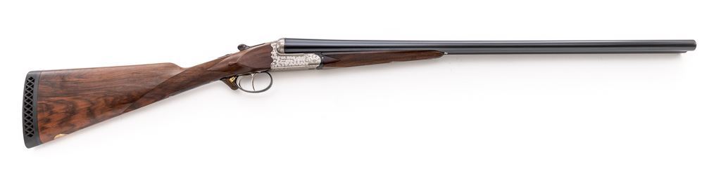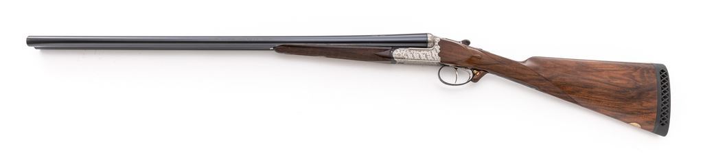 Ferlib Model 7 (F.VII) Side-by-Side Shotgun, #33320. 12 ga. 28" solid rib barrels have concave, tapered, hand-filed rib, 2-3/4" chambers, and are choked IC./Full. The Anson & Deeley scalloped boxlock action features double underlug lockup, double triggers with hinged front trigger, automatic safety, and auto ejectors. Receiver and top tang are coin finished, with full coverage of Engilsh scroll engraving; trigger guard and lower tang are blued and also engraved. Splinter forend and straight-grip buttstock are satin-finished select walnut and feature push-button forend release, extensive checkering done at 24 LPI, and unengraved gold medallion; a trigger guard finger protector and Pachmayr recoil pad have been added. Stock dimensions are 14-3/4"x1-3/4"x2-1/4". Mfg'd in Italy in 1979. Condition is near excellent as used very little and well cared for. There are a few handling marks to wood, but action still locks tight and functions correctly; bores are mirror bright. Est.: $3,500-$4,500. (Modern)