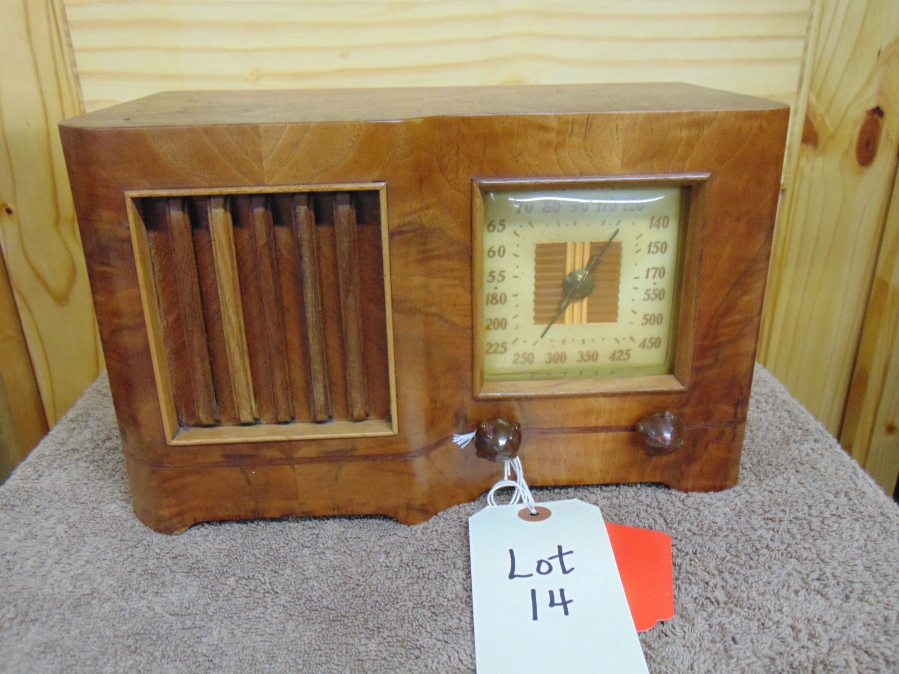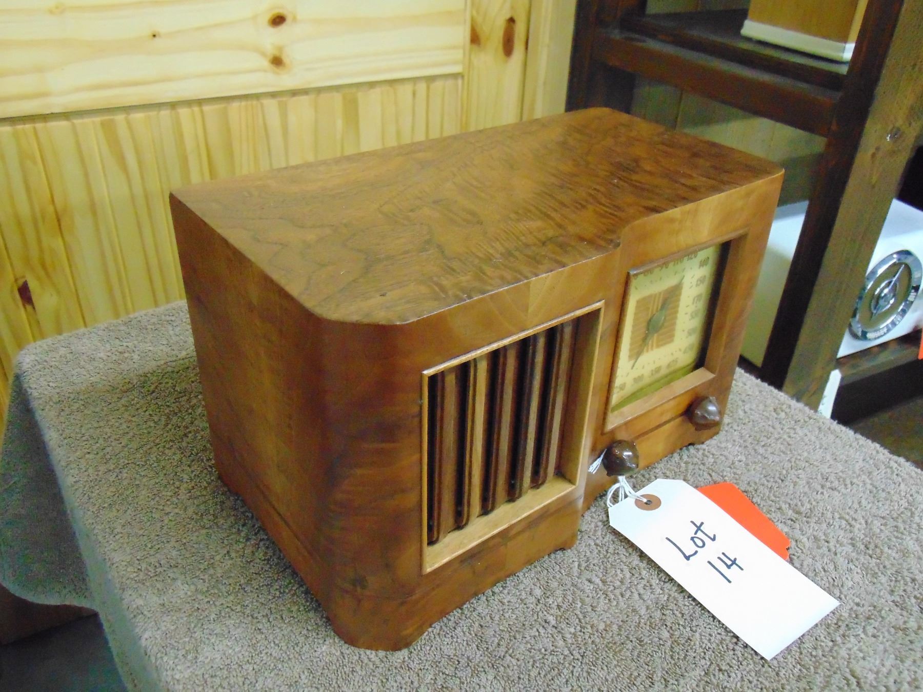 Burl wood table set; Ingraham cabinet; model S-7403-5; works; nice