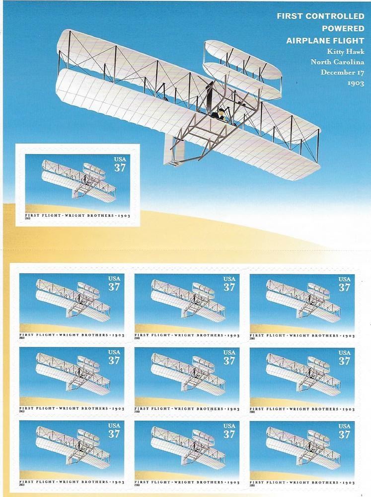 USPS 2003 First Controlled Flight of The Wright Brothers Sheet of 10 x 37 Cent Stamps Scott 3783