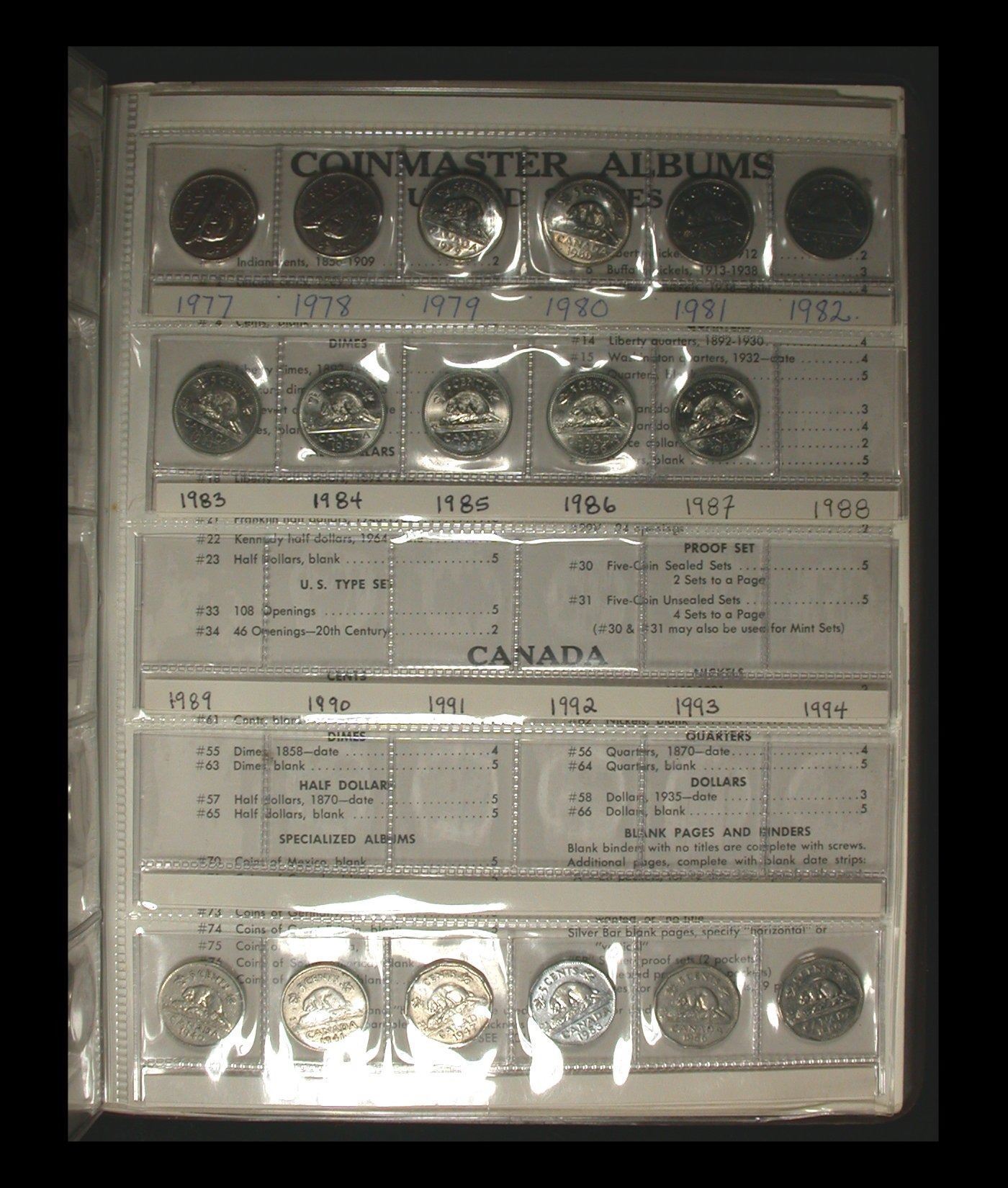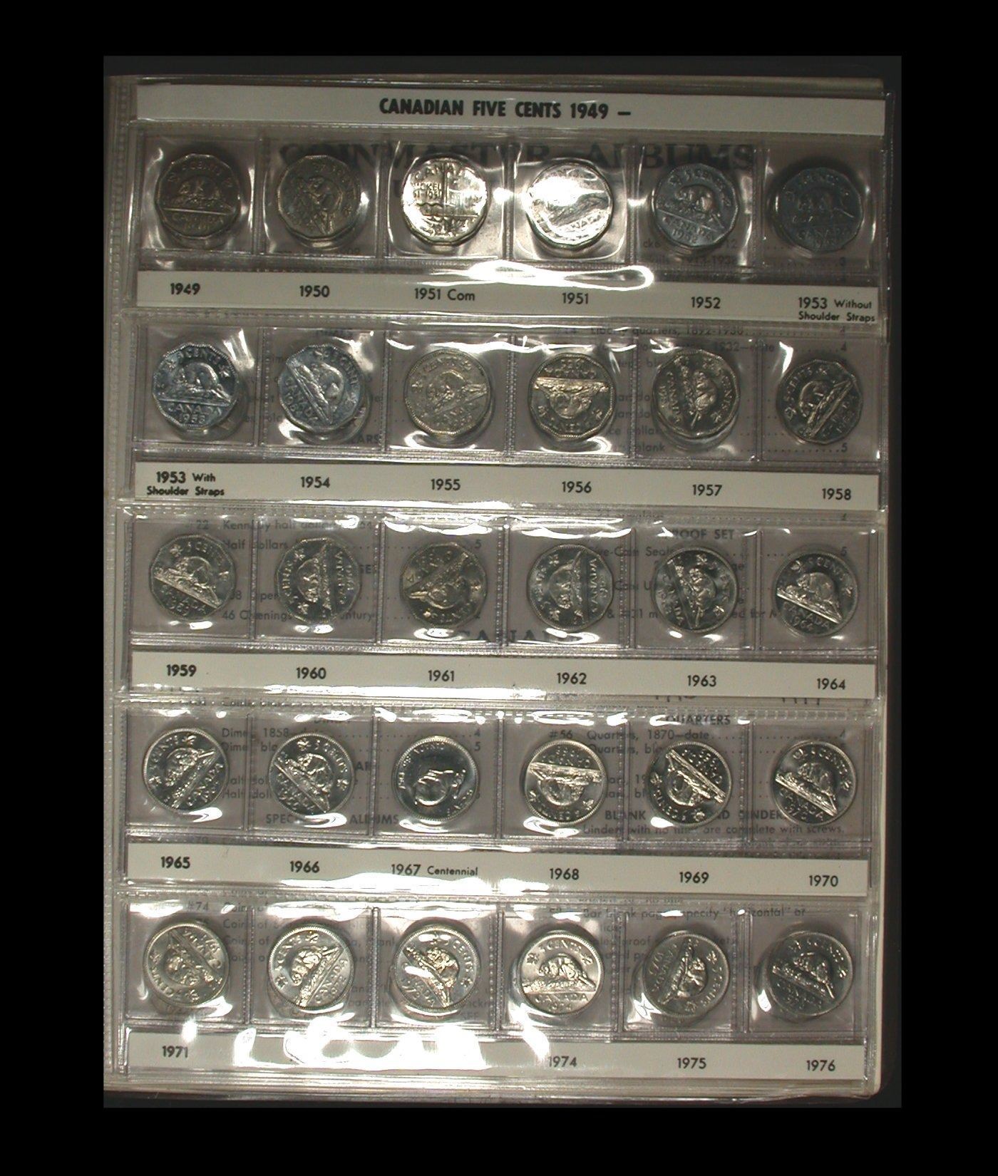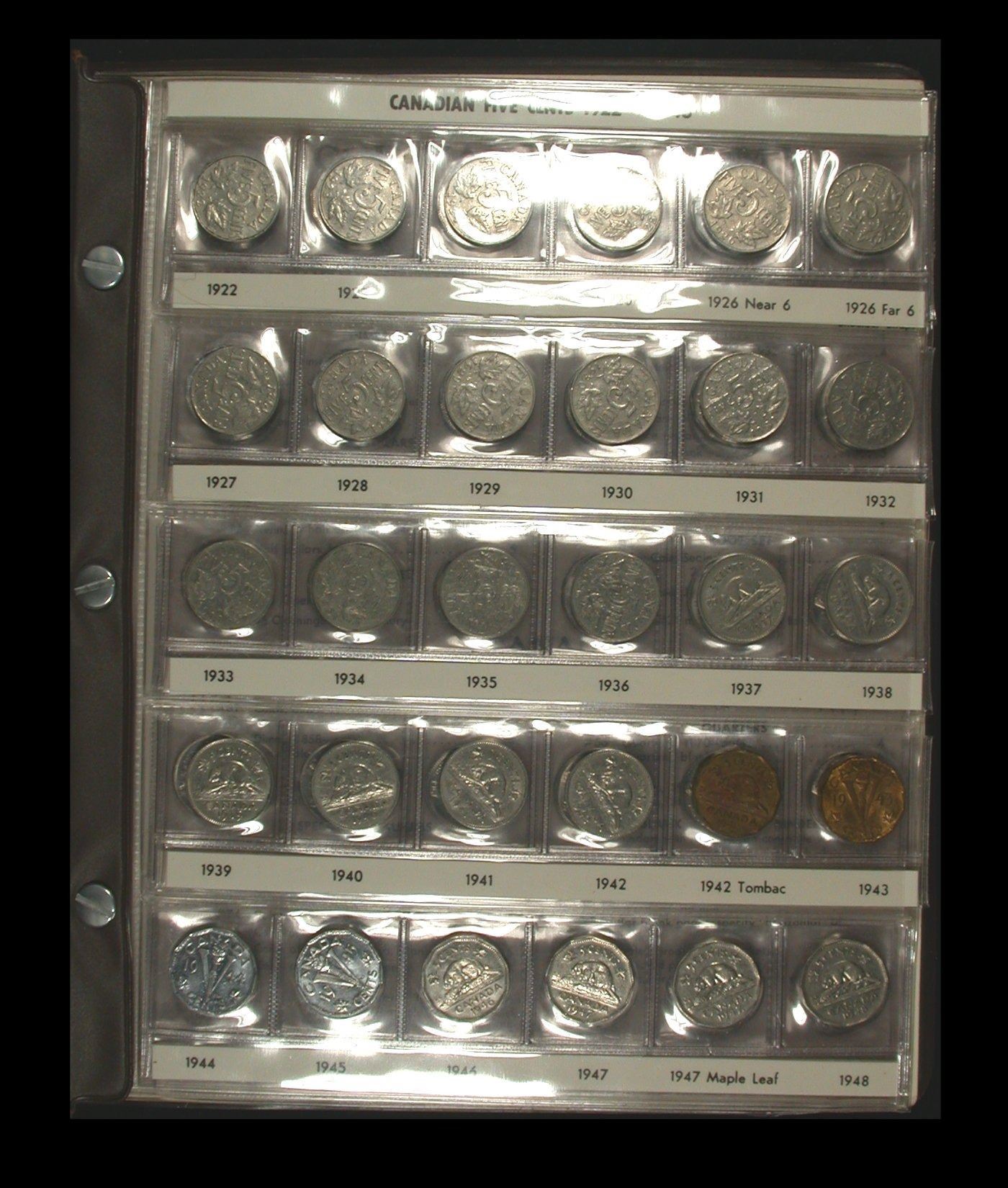 A decent date-set of Canadian Five Cent nickel coins, 1922 to 1987 inclusive, including strong VG 1925, and a 1926 Far 6 variety in Fine. 1956 and later are generally BU, and overall a nicely-assembled set housed in a brown Harco Coinmaster album.