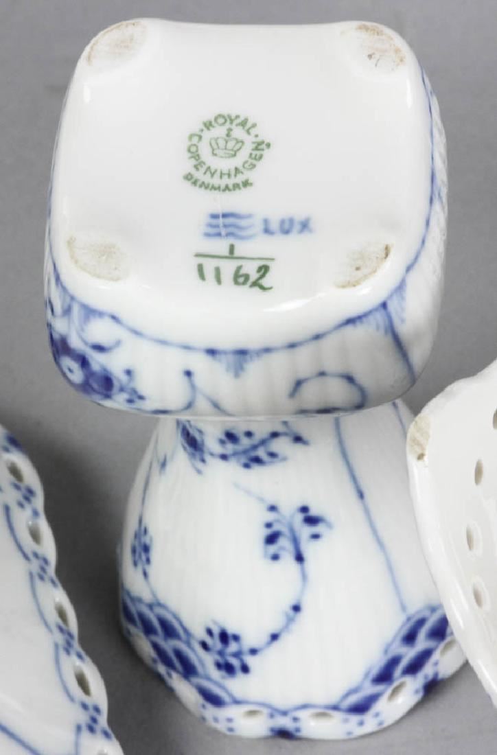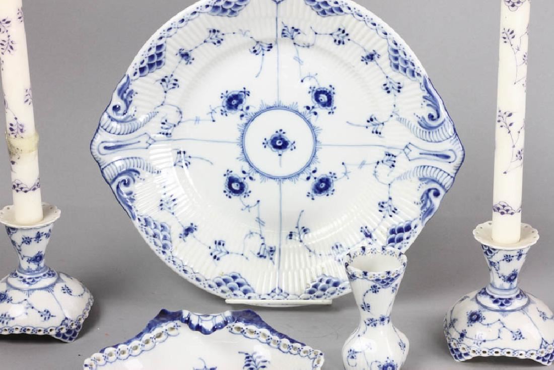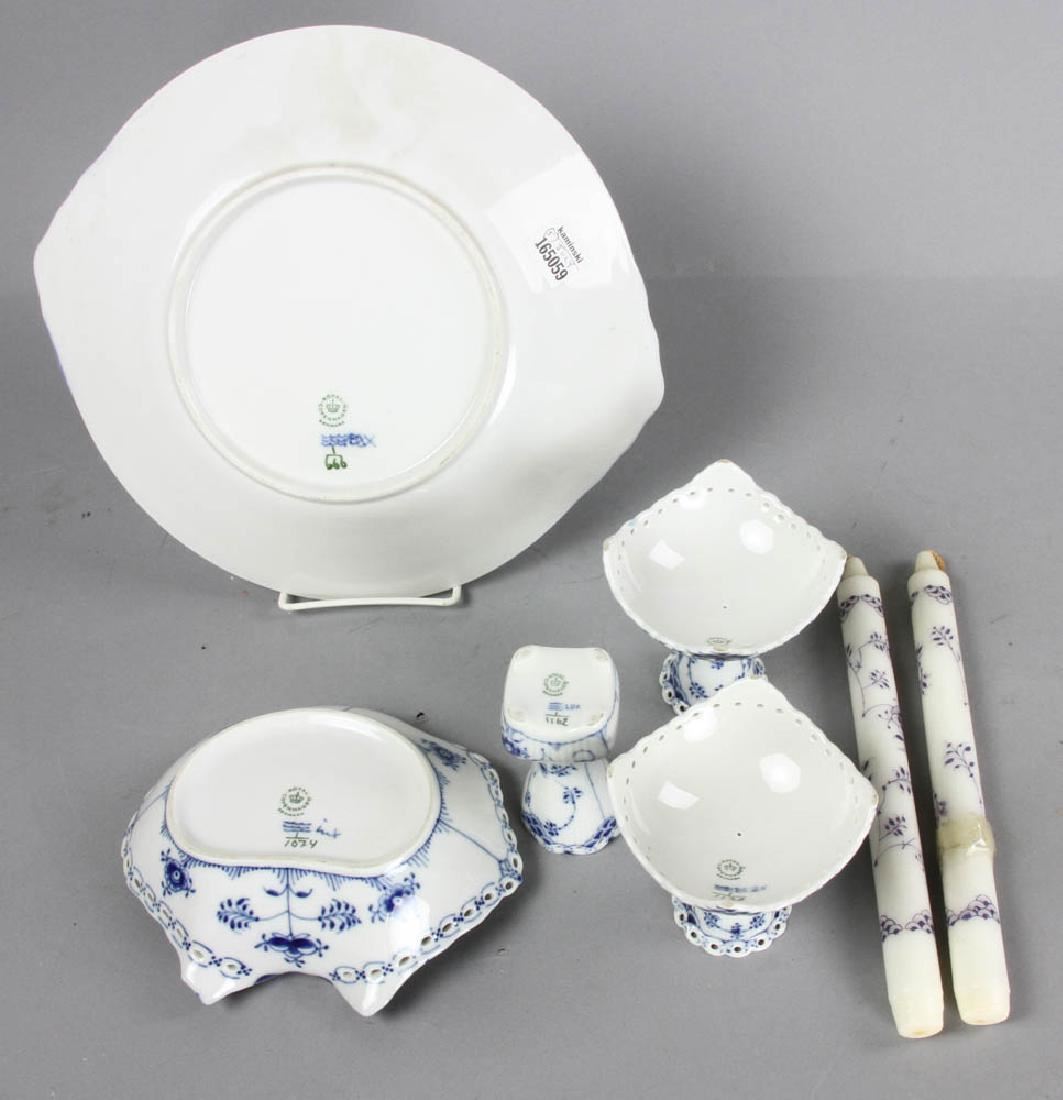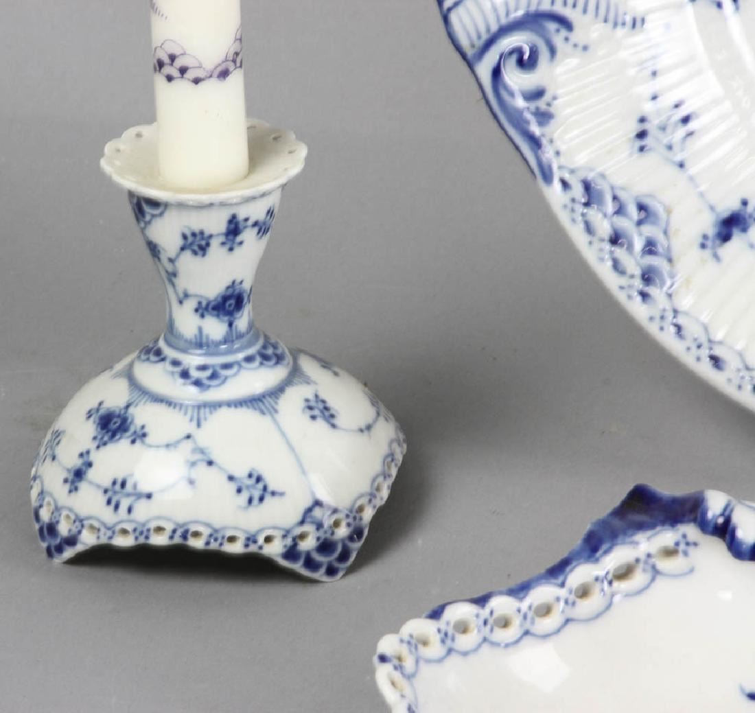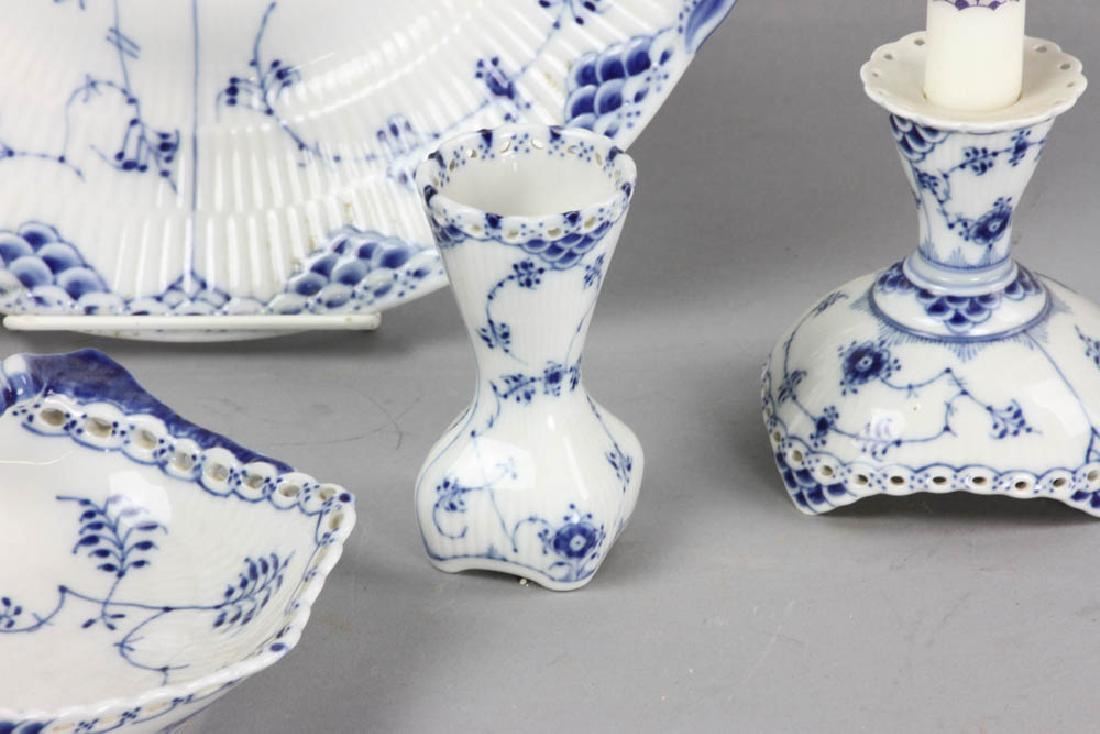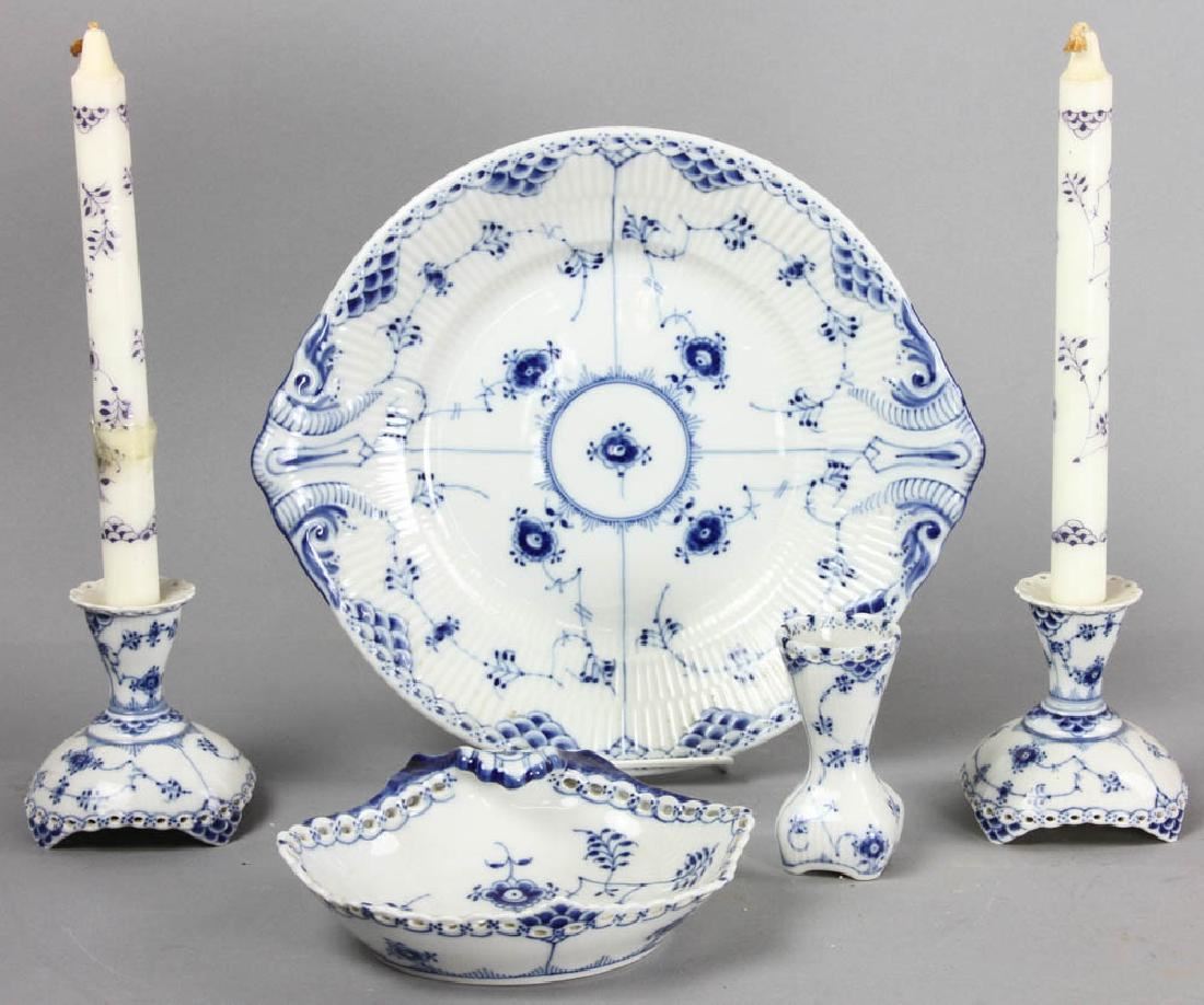 Five pieces of Royal Copenhagen 'Lace' pattern porcelain, to include: 11" platter; 7 1/4" x 6" bowl; pair of 4" H candlesticks; 4" H bud vase. Provenance: West Palm Beach, Florida estate.