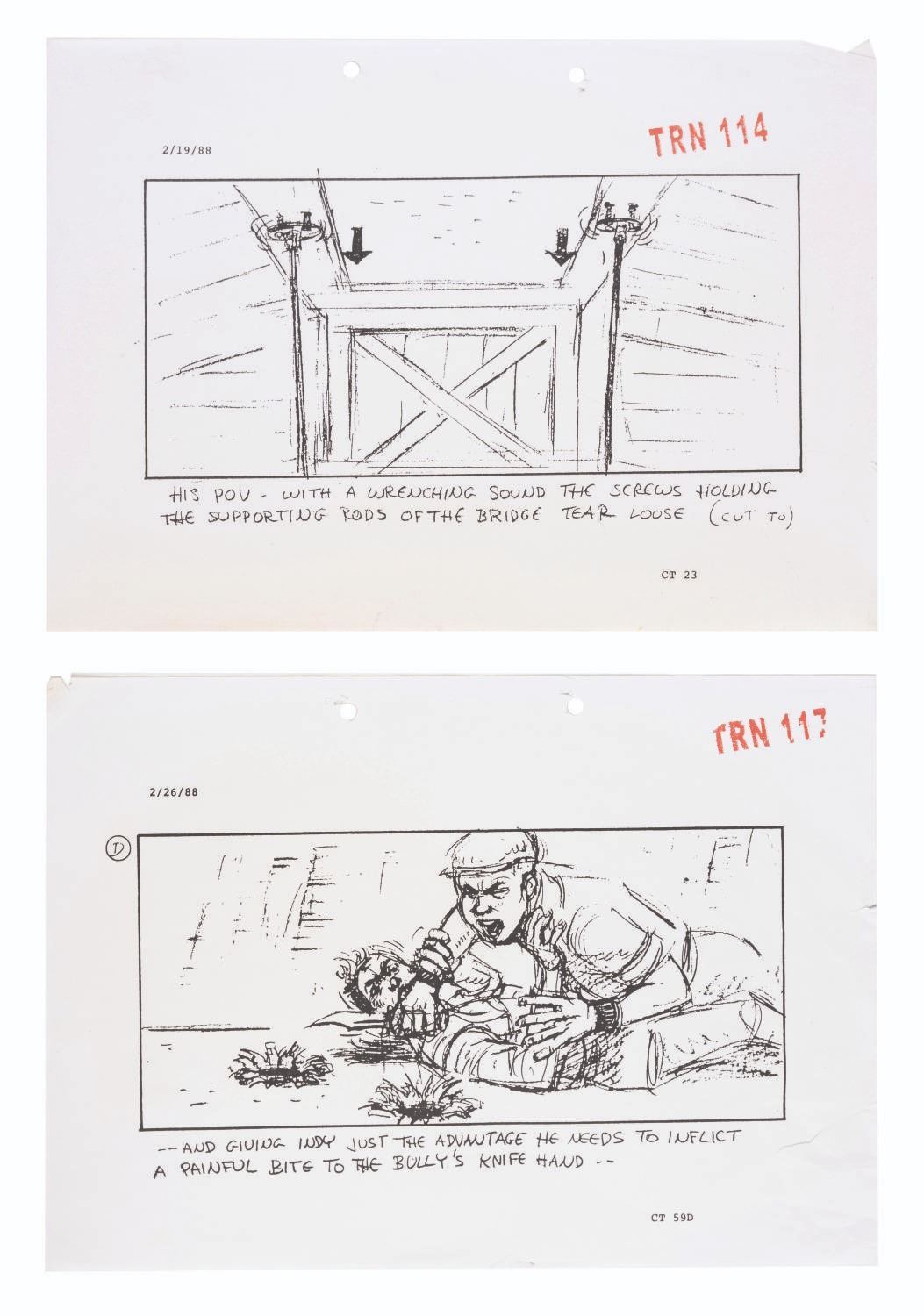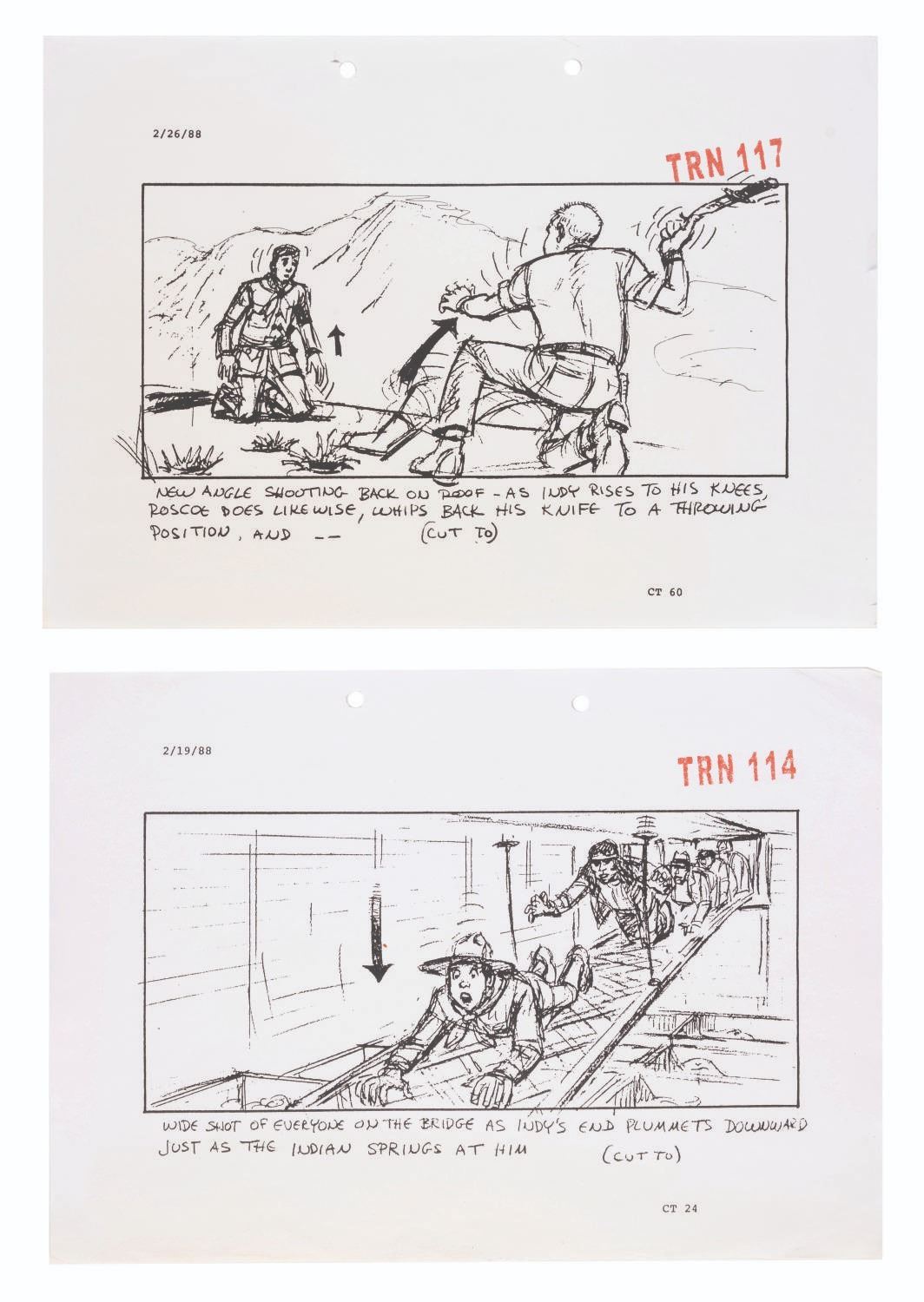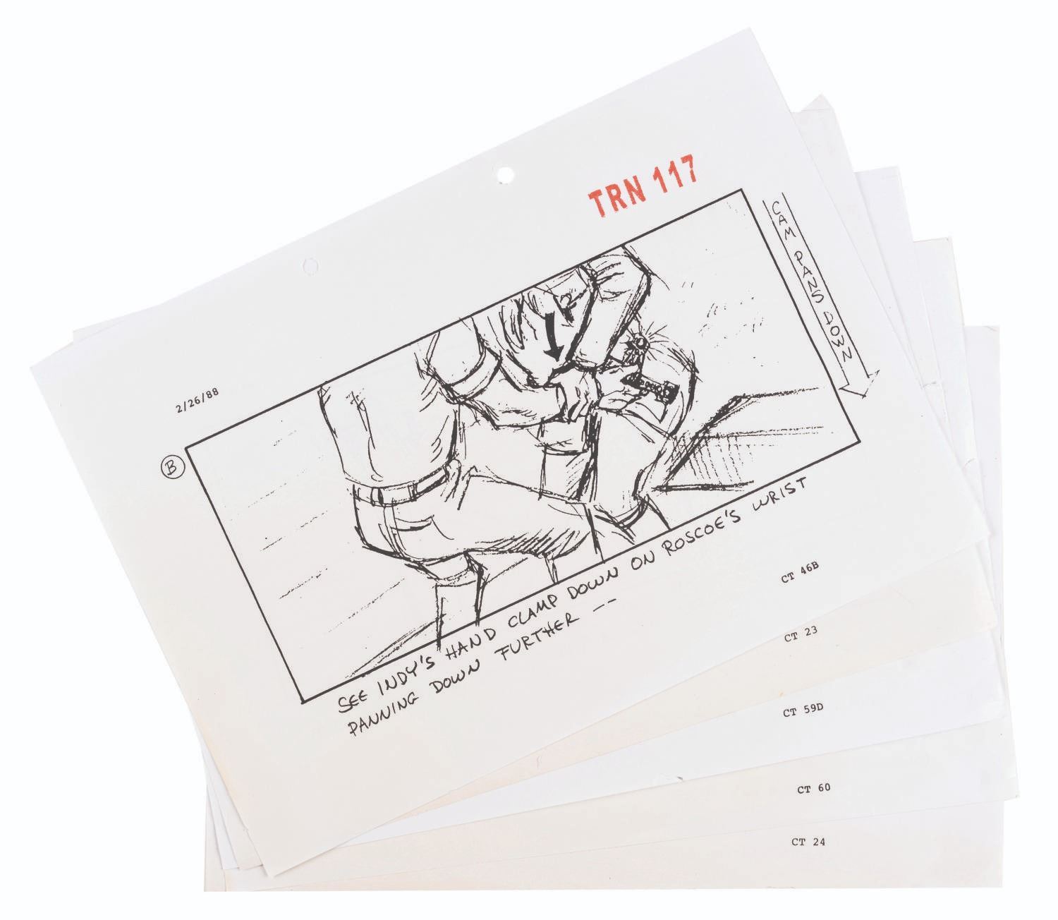 (Paramount, 1989) Five production-used storyboard pages from "Indiana Jones and the Last Crusade.” The photocopy storyboard pages are dated February 26, 1988, and feature River Phoenix as young Indiana Jones in the exciting opening scene. Measuring 8.5” x 11” each, the storyboards are in good condition with edge wear, creasing, and tears from production use.