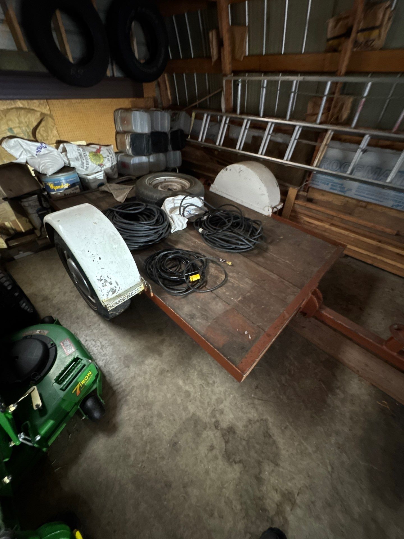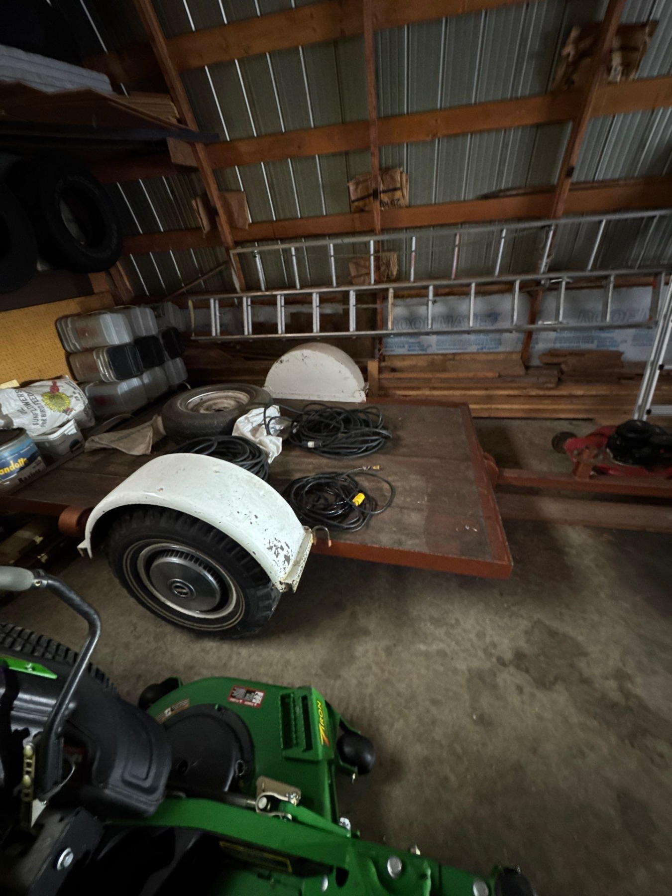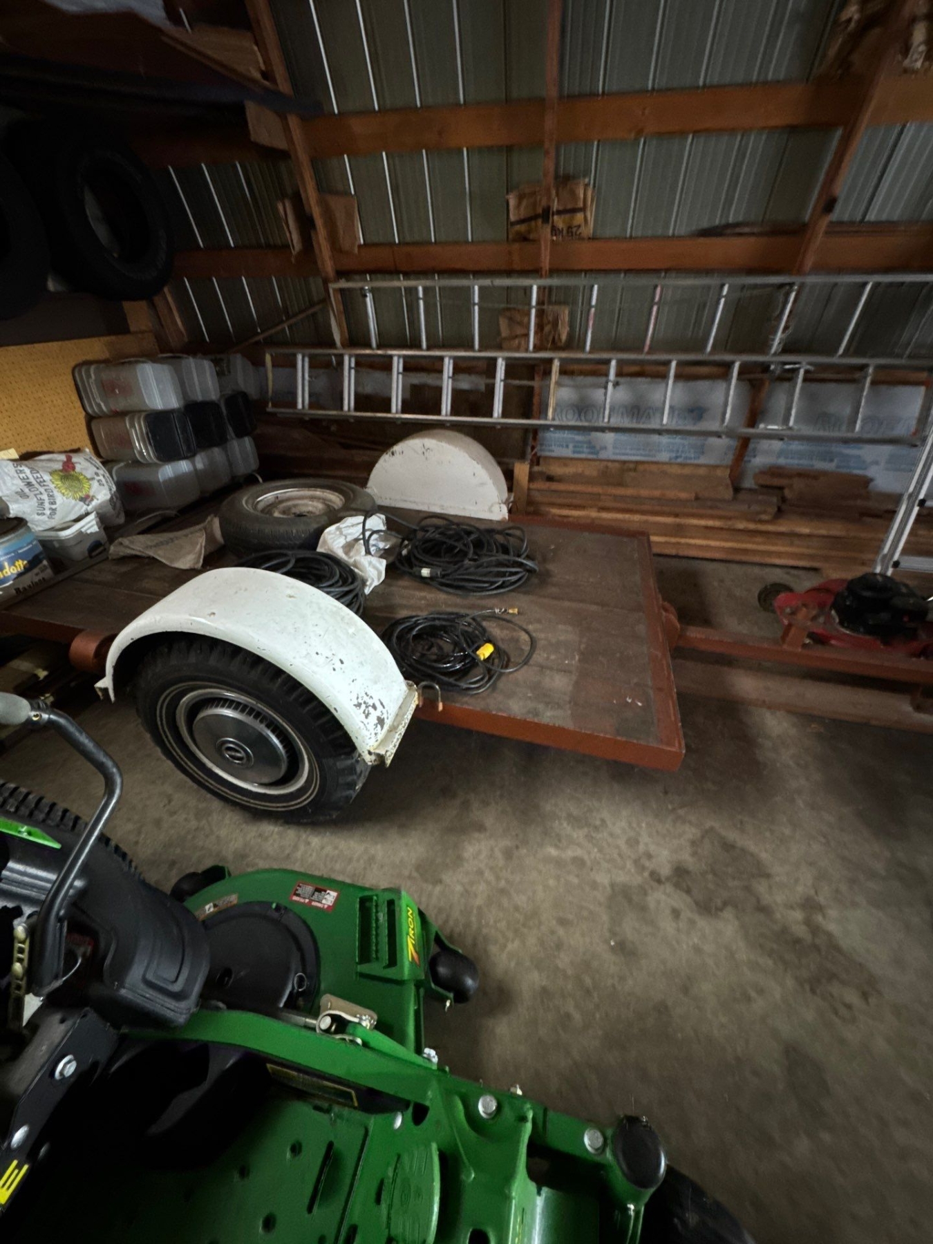 Flat deck trailer, very nice, well built, includes spare tire, and tire mount fuuly painted full size tires with all electrical. for Jhondeer tractors or toys 8 foot deck