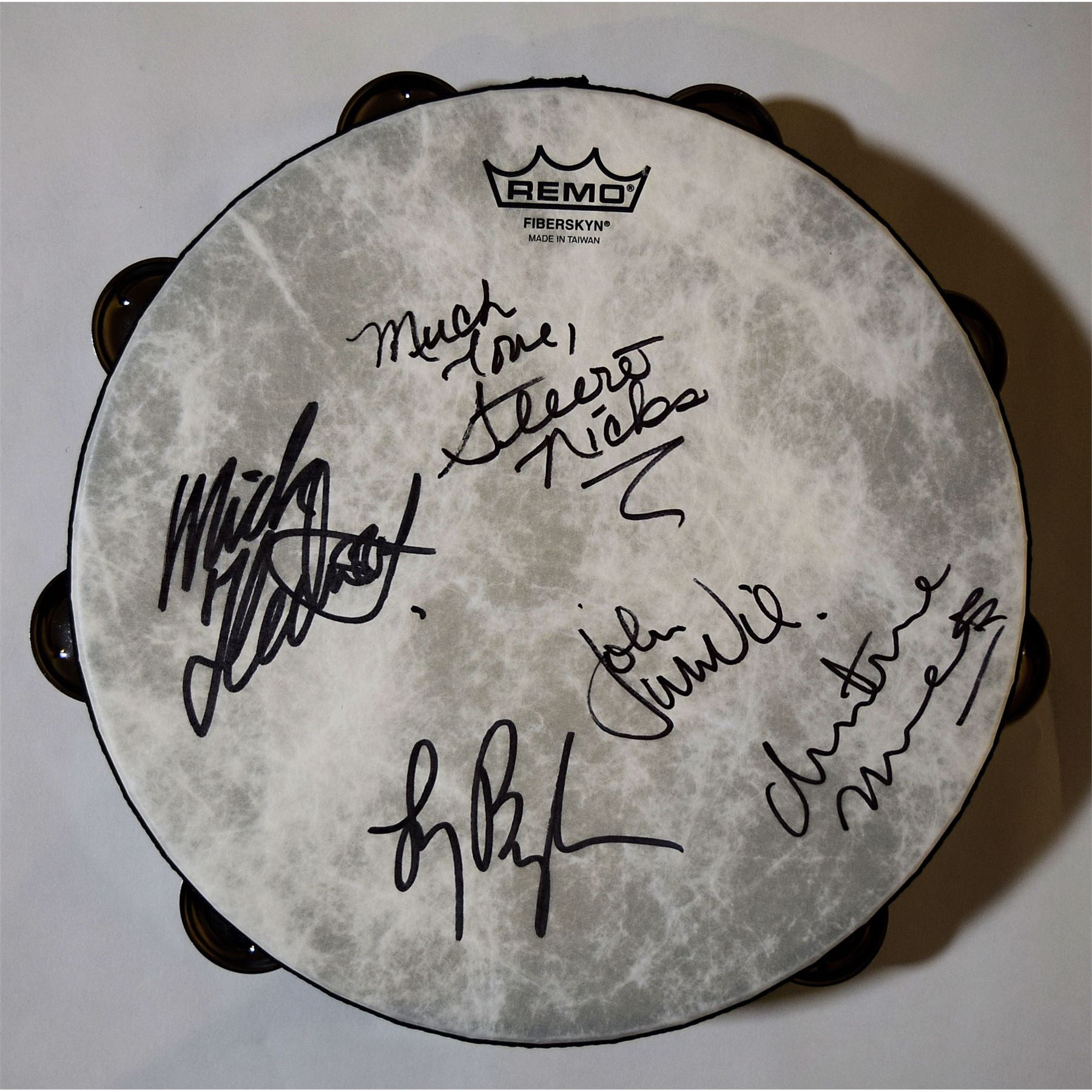 Fleetwood Mac signed tambourine. Signed: Much Love Stevie Nicks, Mick Fleetwood, Christine McVie, John McVie & Lindsey Buckingham.