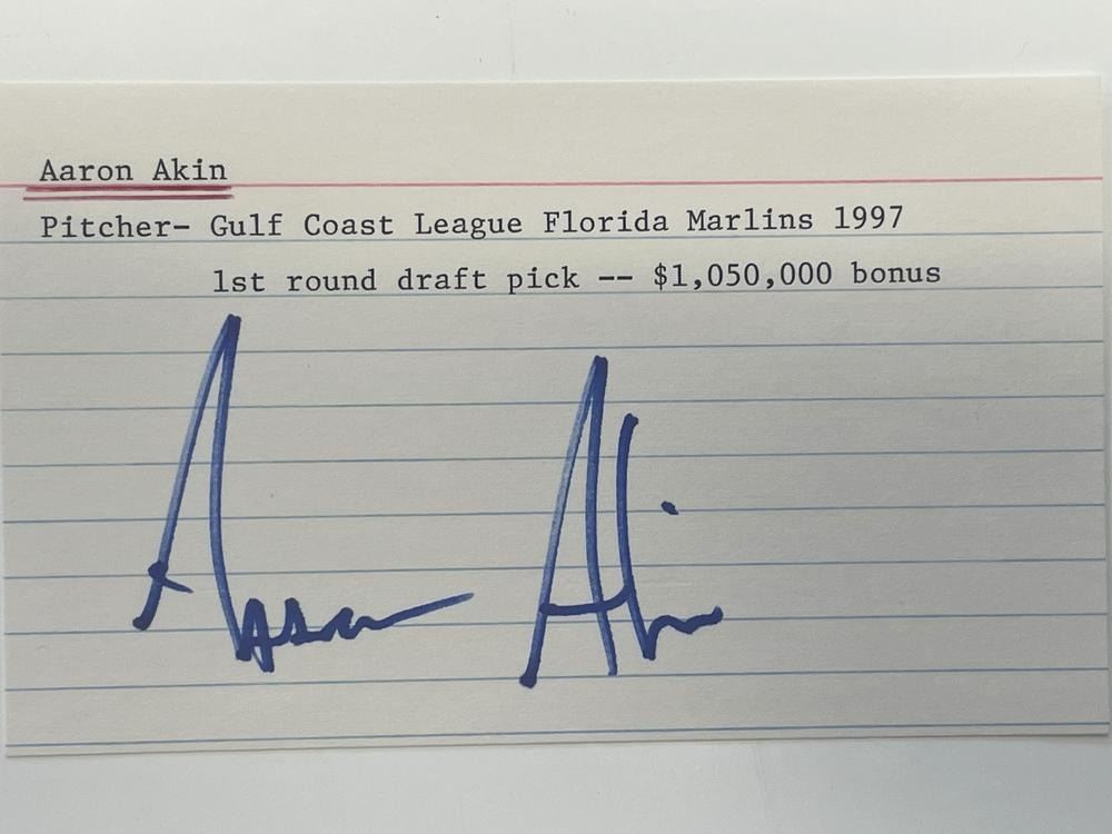 Florida Marlins Aaron Akin autograph note. 3x5 inches
