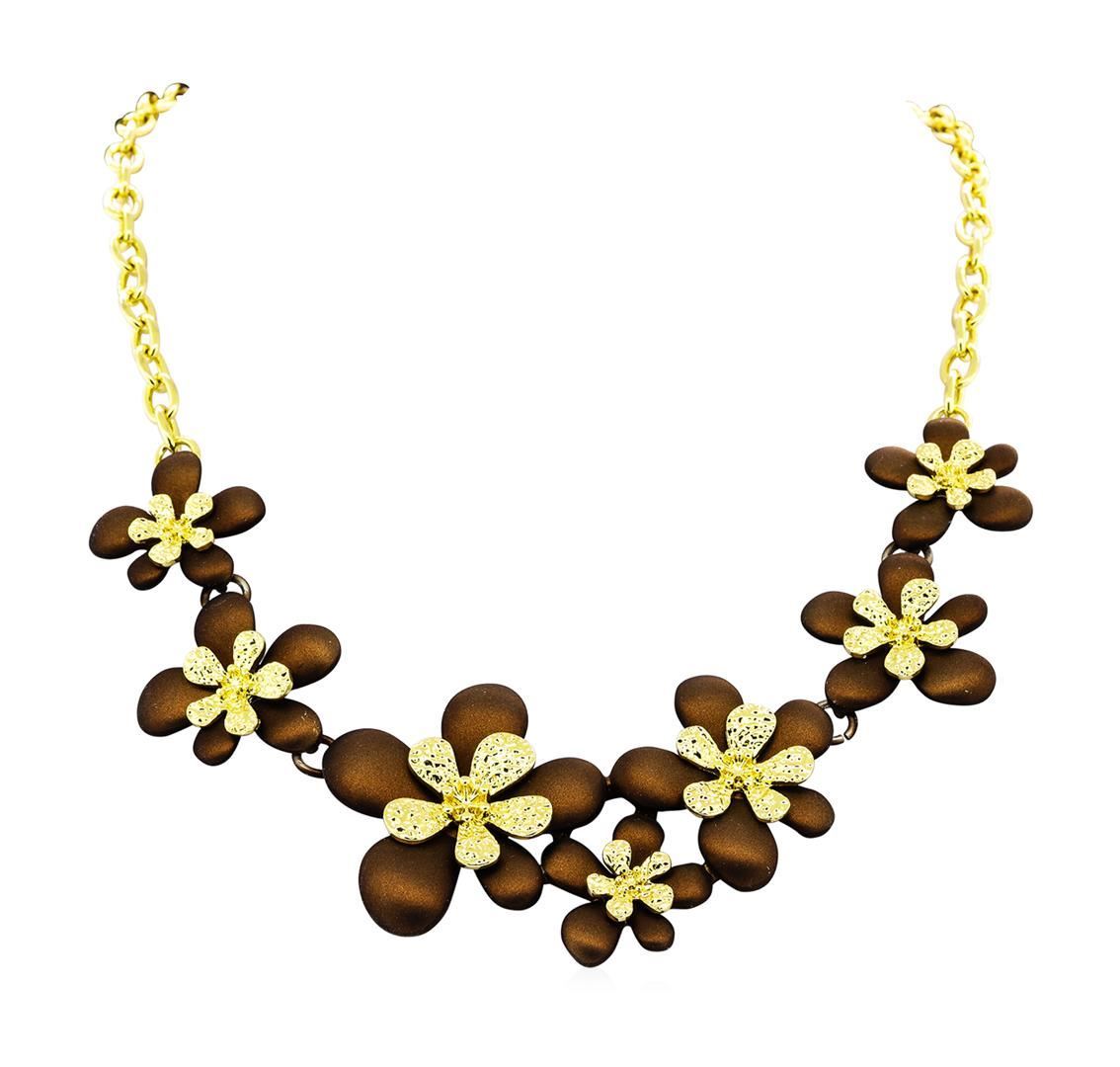 High end designer jewelry. Flower Hand Painted Necklace - Gold Plated. Gold Plated Chain/3" Ext Clasp. Bronze/ Gold. 16inches. Total Weight: 36.8 grams.