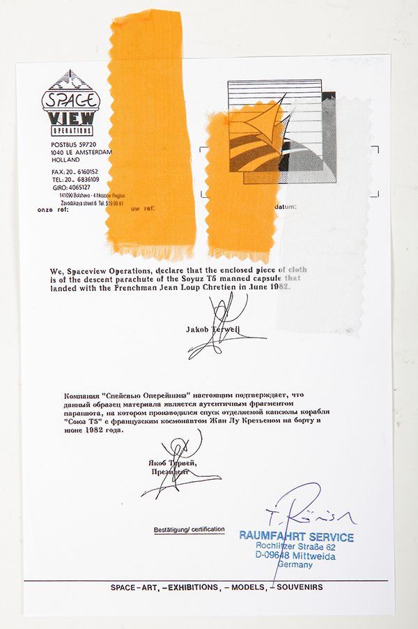 Flown -- Soyuz T5 Capsule Parachute Silk (3 Pieces). A signed COA (copy) accompanying the fabric reads, "We, Spaceview Operations, declare that the enclosed piece of cloth is of the decent parachute of the Soyuz T5 manned capsule that landed with the Frenchman Jean Loup Chretien in June 1982." 2 orange and 1 white piece of parachute material are included. A nice example of flown Russian material.