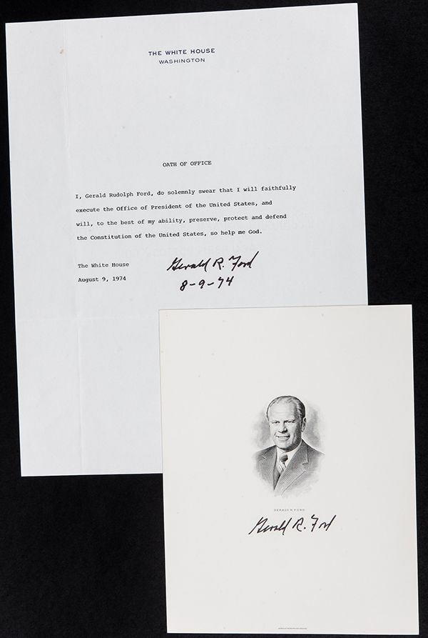 Ford, Gerald R (1913-2006) 38th President of the United States (1974-1977). Typed souvenir copy of Gerald R. Ford's Oath of Office signed and dated "Gerald R. Ford / 8-9-74," on The White House watermarked stationery, 1 page, 8� x 11 in., Washington. August 9th was the date Richard Nixon resigned the presidency and Vice President Ford took over as President. Because of the unusual circumstances of his taking office, these souvenir copies of President Ford's Oath of Office are popular. Accompanied by a portrait by the Bureau of Engraving and Printing signed "Gerald R. Ford," 6 x 7� in. Both items in this lot were signed after President Ford retired to Rancho Mirage, California; both in excellent condition. Ex Claude Harkins Collection.