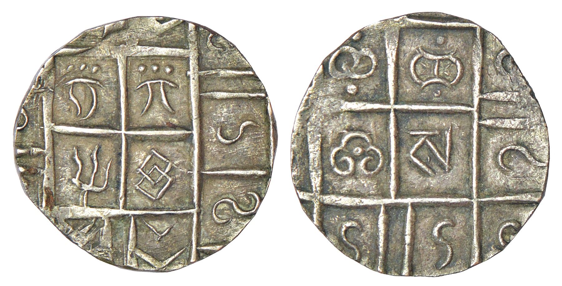 Bhutan Kingdom, Hammered coinage, period IV (1910-1927 AD), silver ½ rupee, ND (1910-1927), both sides Buddha symbols, KM 19-20, 4.86g.