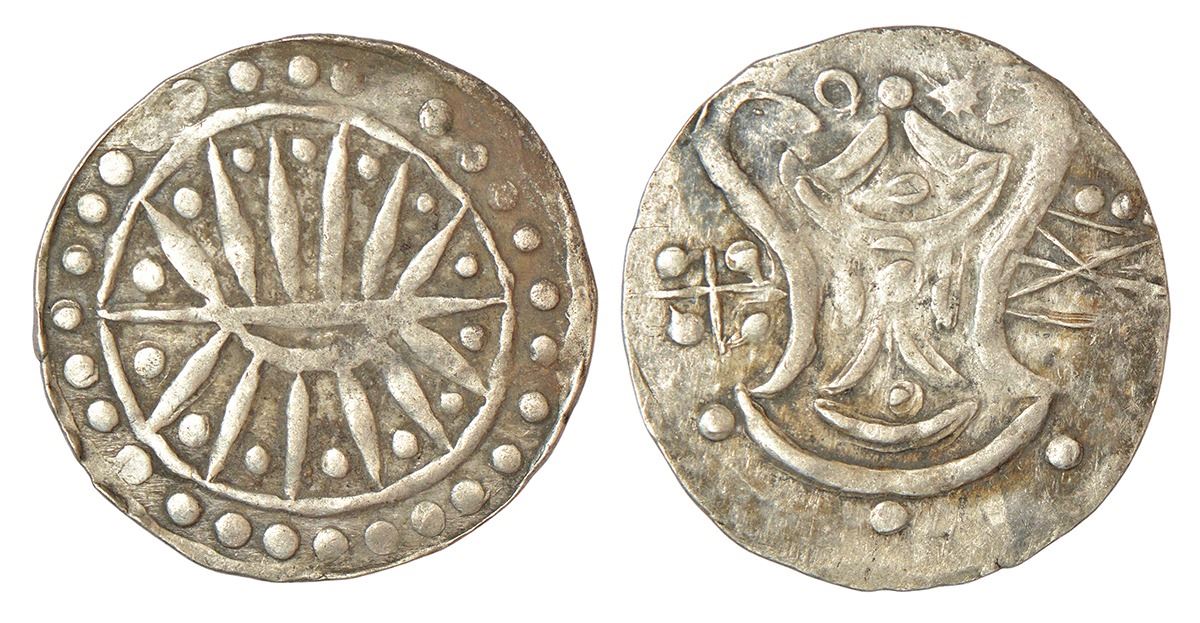 Foreign: Burma, Kingdom of Funan (400-550 AD), silver unit, MACW 5246-5251, 9.33g. Obv: Rising sun with six rays below and six other above horizontal line within a circle. Rev: Stylized temple.
