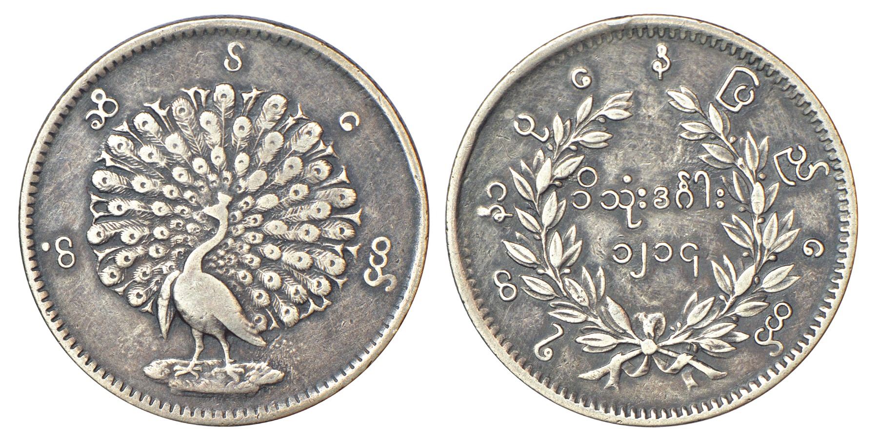 Burma, Mindon mint (1853-1878 AD), silver kyat (1 rupee) dated CS 1214 (1853 AD), KM 10, 11.58g. Obv: Peacock facing left. Rev: Denomination within wreath.
