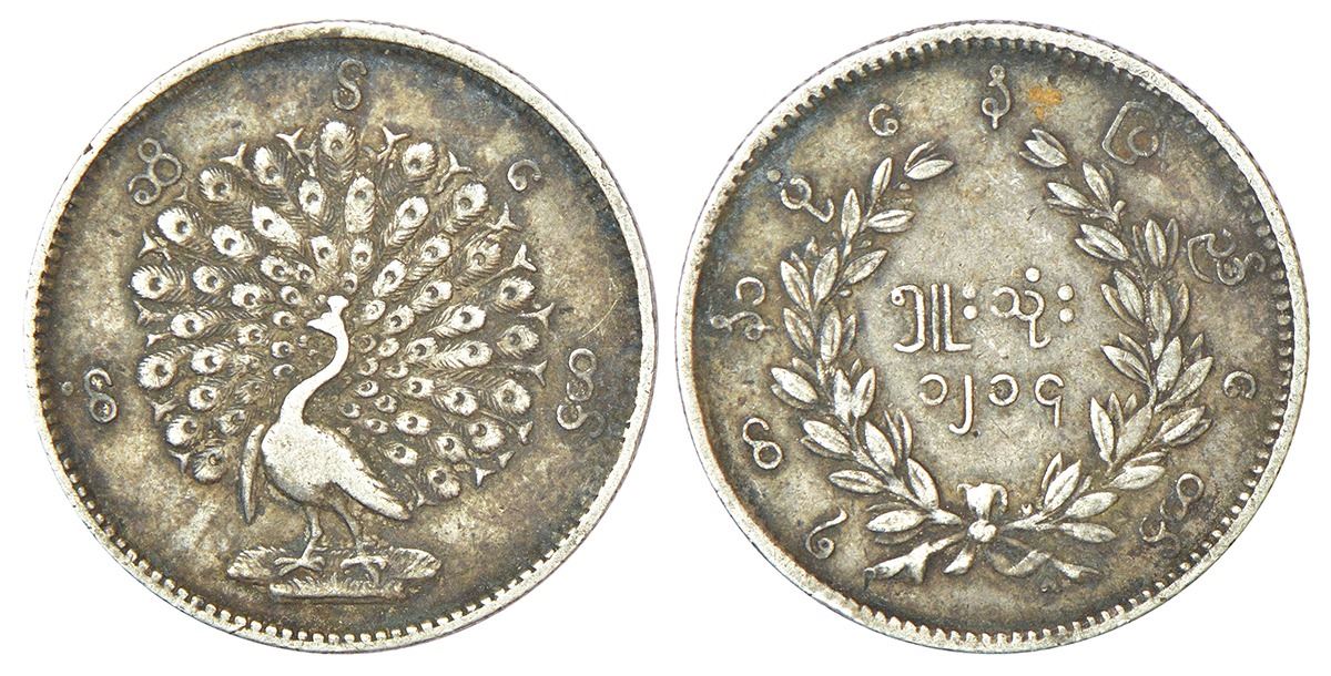 Burma, silver Mu (½ rupee), Mindon mint, dated CS 1214 (1853 AD), KM 9, 5.60g. Obv: Peacock facing left. Rev: Denomination within wreath.