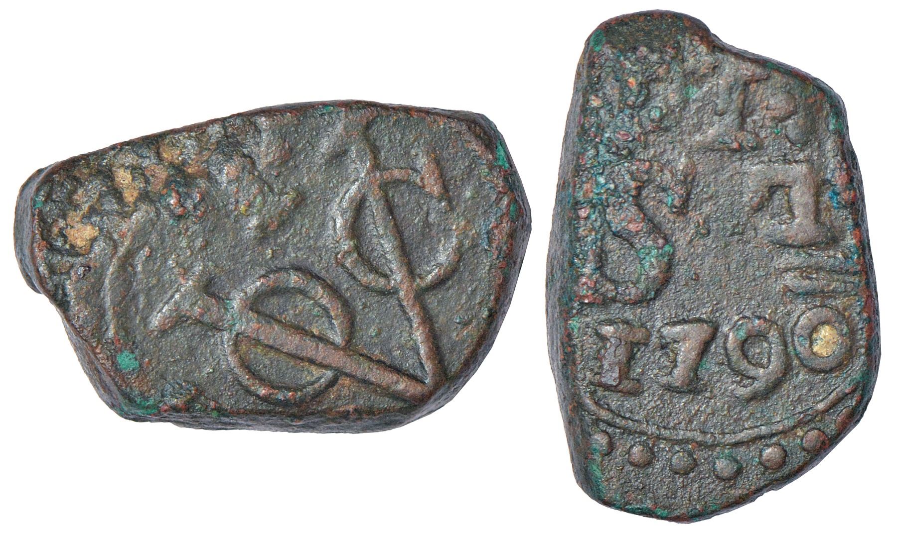 Ceylon, Dutch occupation (1640-1802 AD), copper stuiver, Trincomalee mint, AD 1790, KM 34, 13.58g. Obv: Lettering 'T' above VOC monogram. Rev: Value and date.