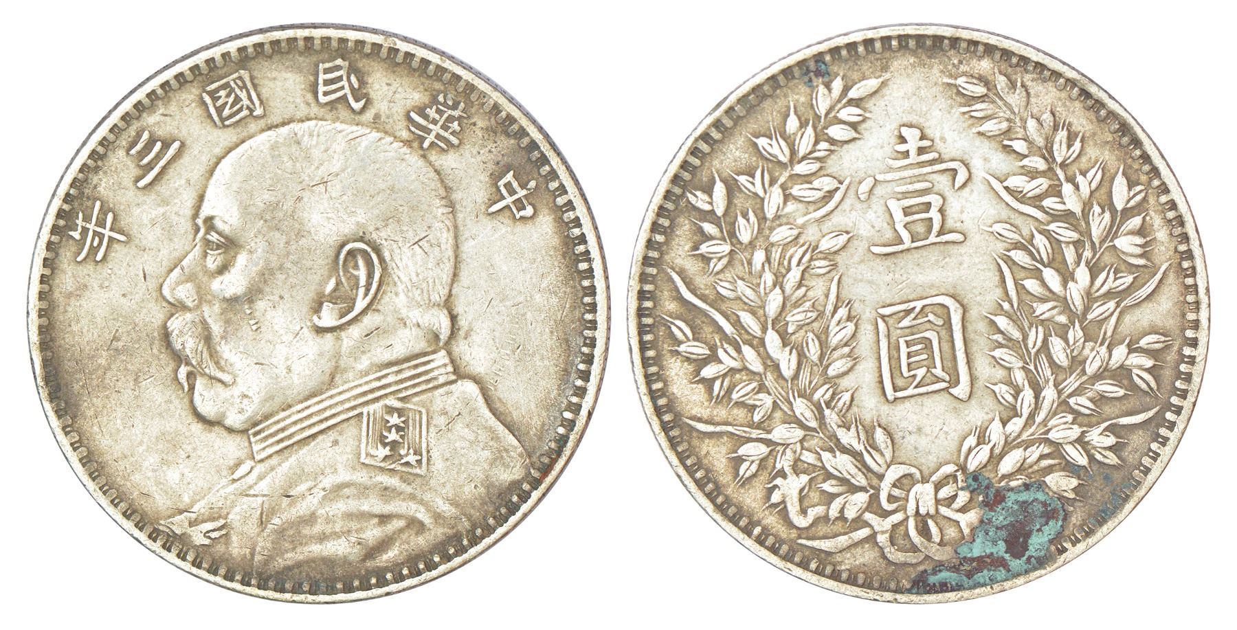 China, 'Fat Man' dollar (1912-1949 AD), silver 1 yuan, Year 3 (1914), KM Y329, 26.67g. Obv: Portrait bust of Yuan Shikai facing to left, with six Chinese characters above. Rev: Two Chinese ideograms within wreath.