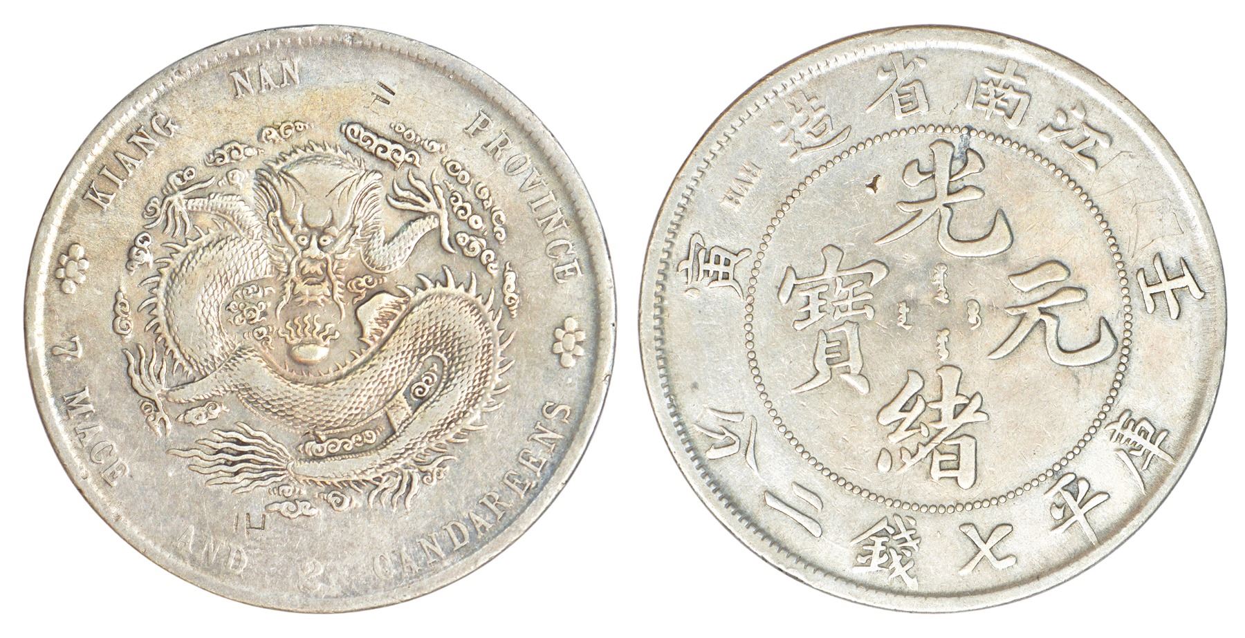 China, Kiang Nan province, Kuang-hsu, silver 7 mace and 2 candareens (dollar), 1904, KM 145a.13, 26.51g. Obv: Dragon at center surrounded by English legend. Rev: Four Chinese ideograms read top to bottom, right left with Manchu characters in the centre.
