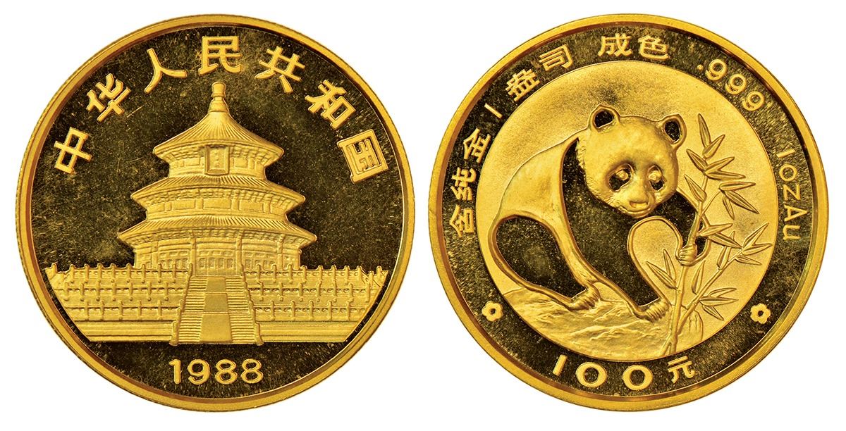 China, People's Republic, Panda series, gold 100 yuan, 1988, KM 187, 31.16g (999 fine, 1oz). Obv: Temple of Heaven, date below. Rev: Panda pawing bamboo within circle, denomination below.
