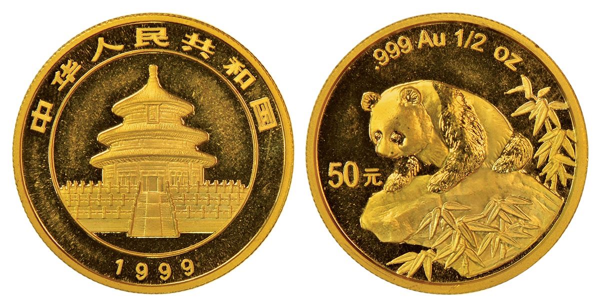 China, People's Republic, Panda series, gold 50 yuan, 1999, KM 1220, 15.57g (999 fine, 1/2oz). Obv: Temple of Heaven, date below. Rev: Panda on ledge, denomination.