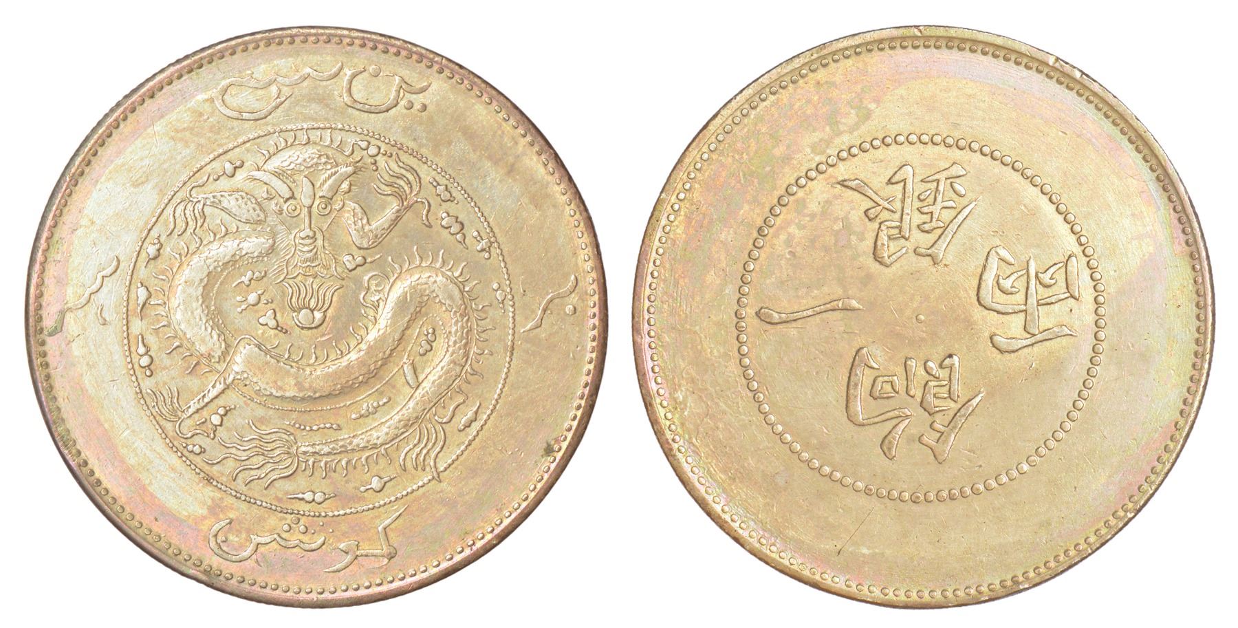Foreign: China-Sin Kinag Province, Kuang-hsu, silver sar (tael), ND (1905), KM Y7.1, 35.70g. Obv: Dragon at center surrounded by Turki legend. Rev: Four Chinese ideograms within dotted border.