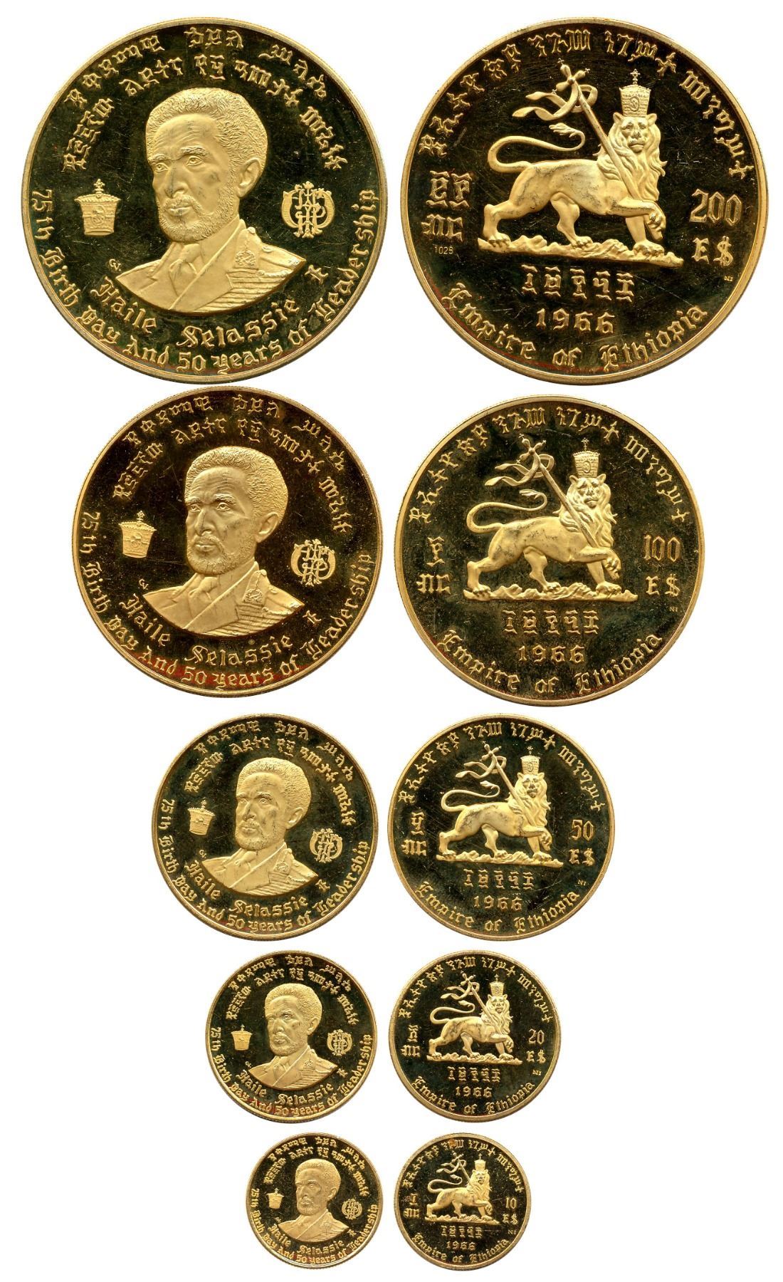Ethiopia, Emperor Hailé Selassié I, 2nd Reign, Gold, Proof, Complete Set of 5, 200, 100, 50, 20 & 10 Birr, 80.07g,40.39g,20.10g,8.04g,4.07g, Commemorating 75th Anniversary of the Birth and 50th Anniversary of the Accession, Obv: Bust 3/4 left of the Emperor divides a crown and a shield, legend “Haile Selassie 75th Birth Day And 50th Years of Leadership” around, Rev: Crowned lion right, right foreleg raised holding ribboned cross, at sides value in Ethiopian and English, below date in two different calendars. Immaculate condition, rare as a complete set of 5.