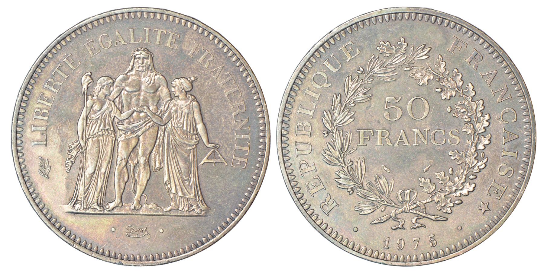 France, silver 50 francs, 1975, KM 941.1, 29.87g. Obv: Hercules group. Rev: Denomination within wreath.