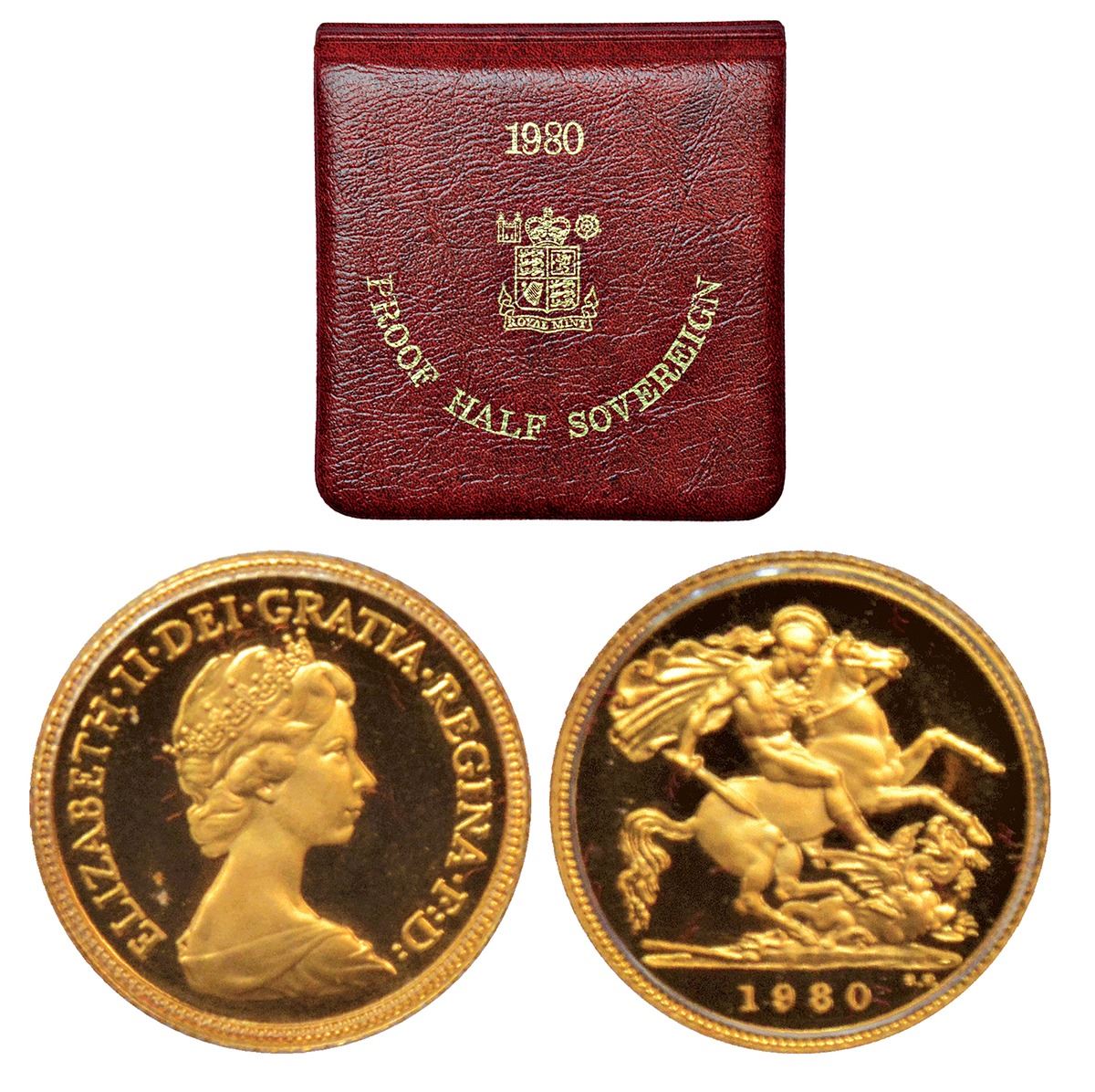 Great Britain, Elizabeth II, gold ½ sovereign, Proof, 1980, KM 922, 3.99g. Obv: Crowned portrait of Queen Elizabeth II (Young Bust) right. Rev: St George on horseback slaying the dragon right, date and engraver's initials in exergue.