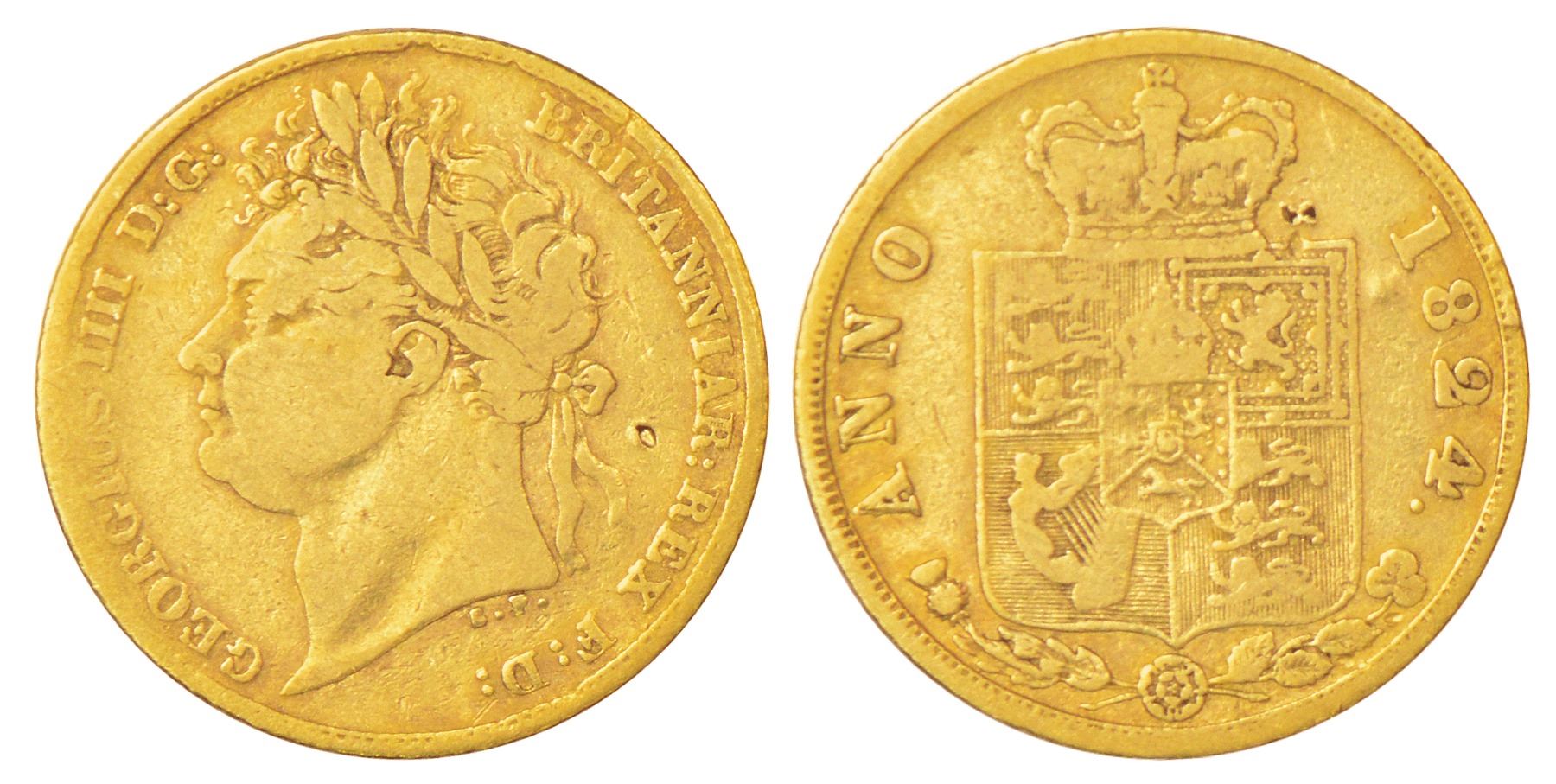 Great Britain, George IV (1820-1830 AD), gold ½ sovereign, AD 1824, KM 689, 3.85g. Obv: Portrait bust of George IV. Rev: Crowned shield, legend ANNO and date around.
