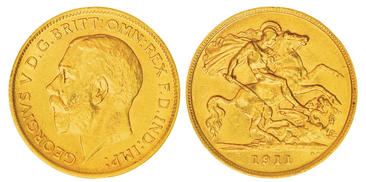 Great Britain, George V, gold ½ sovereign, 1911, KM 819, 4.00g. Obv: Portrait bust of King Edward VII right, legend around. Rev: St. George on horseback slaying the dragon right, date in exergue.