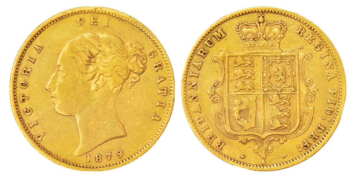 Foreign: Great Britain, Victoria (1837-1901 AD), gold ½ sovereign, 1879, KM 735, 3.94g. Obv: Young uncrowned portrait of Queen Victoria left. Rev: Crowned quartered shield of arms, legend around.