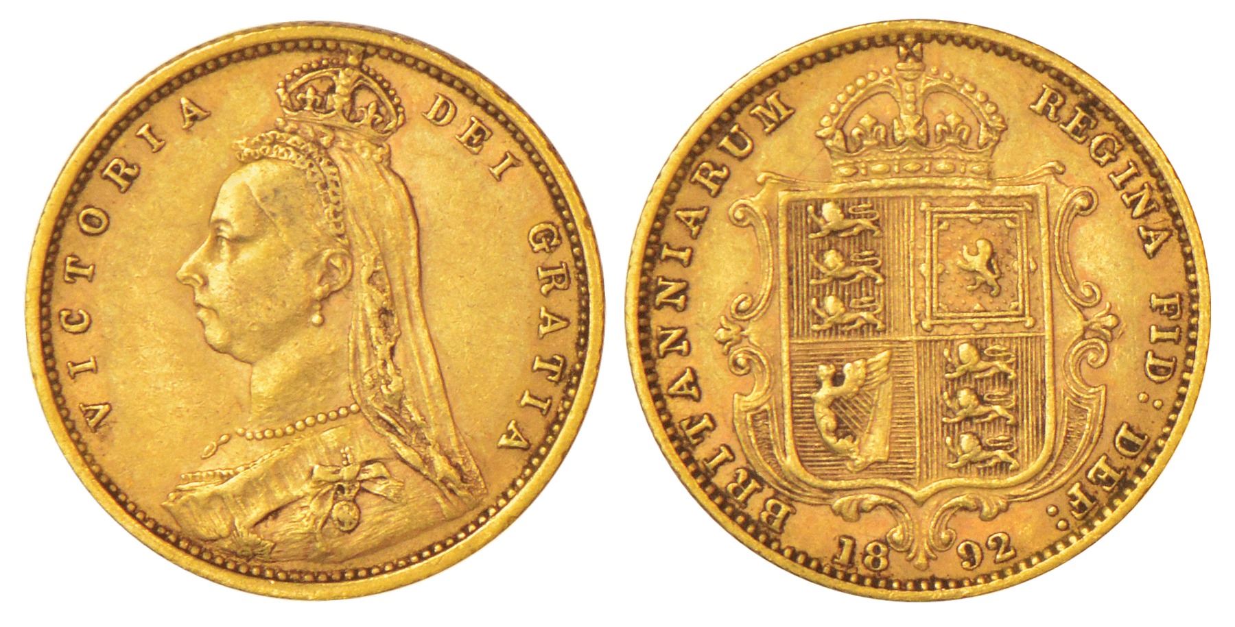 Great Britain, Victoria (1837-1901 AD), gold ½ sovereign, AD 1892, KM 766, 3.96g. Obv: Portrait bust of Queen Victoria. Rev: Crowned quartered shield of arms within wreath.