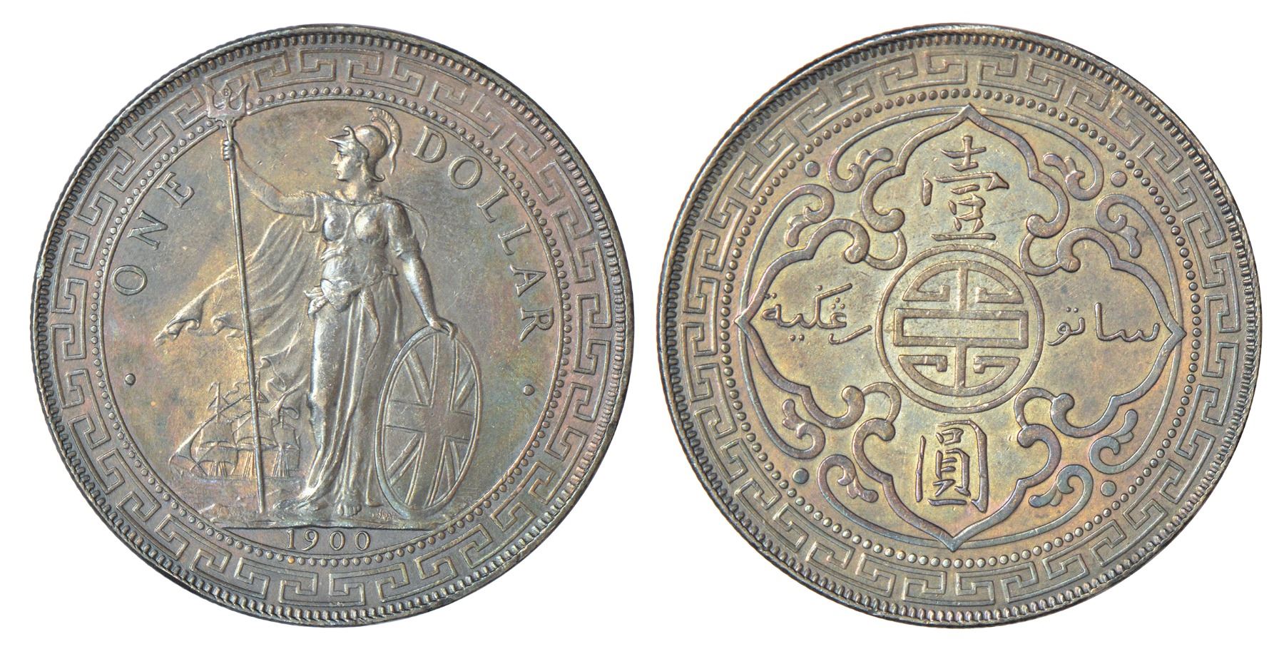 Foreign: Great Britain, trade coinage, silver dollar, Bombay mint, 1900, KM T5, 26.85g. Obv: Britannia standing holding a trident. Rev: Chinese characters and Malay script in ornamental flower.