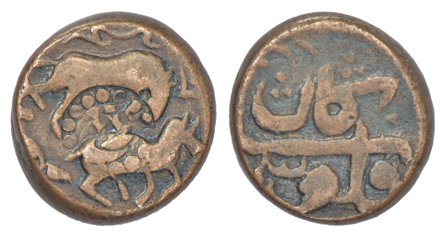 Iran, Safavid period - civic copper coinage, (c.1700-1780 AD), double fulus, Kashan mint, no date, 17.22g. Obv: Lion hunting goat/deer. Rev: Farsi legend Fulus Kashan.