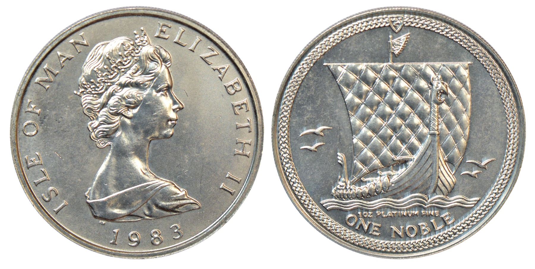 Isle of Man, Elizabeth II, platinum (999 fine), one noble, 1983, KM 110, 31.03g. Obv: Young bust. Rev: Viking ship.