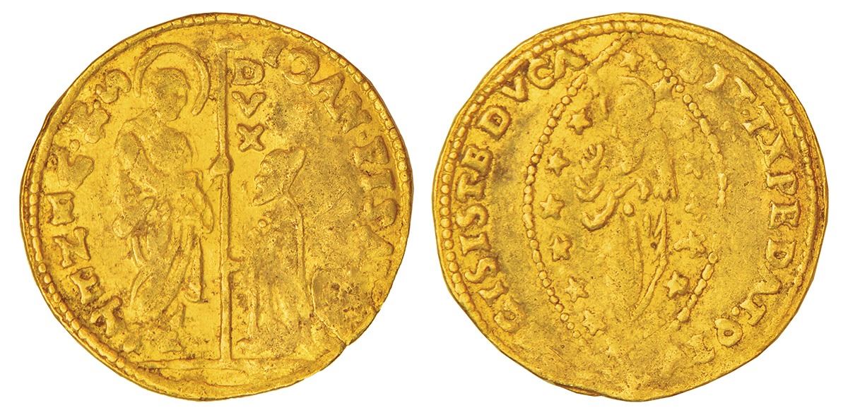 Italian State-Venice, gold zecchino, ND, KM FR#1329, 3.45g. Obv: Doge kneeling before St. Mark; legend IOAN PISA…. Rev: Christ standing in starred field.