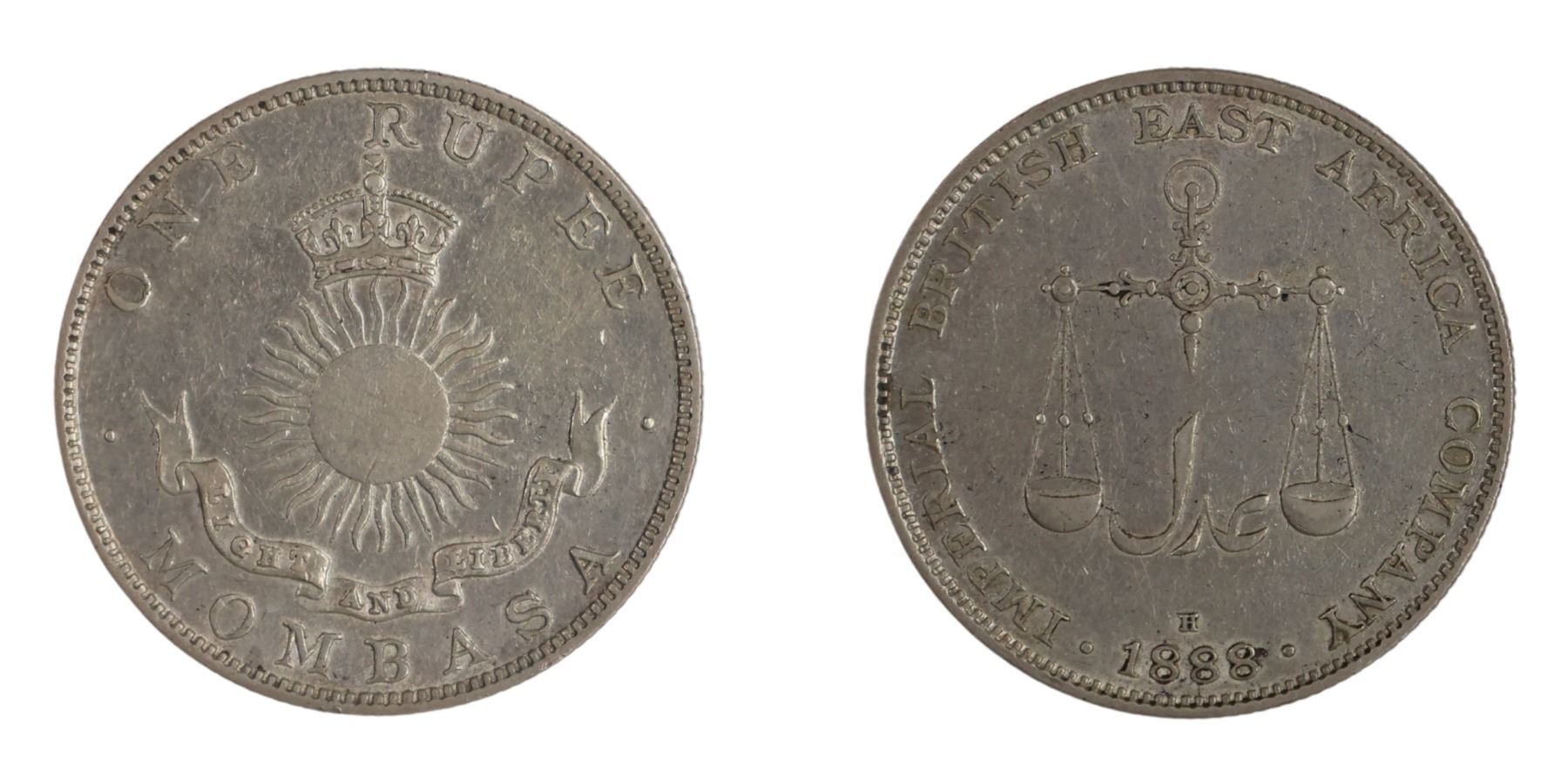 Mombasa, IBEA (Imperial British East Africa) Coinage, Silver Rupee, 11.63g, 30.41mm, 1888 AD, Obv. Sun with crown above. Lettering: ONE RUPEE LIGHT AND LIBERTY · MOMBASA · Rev. A pair of scales above an Arabic inscription. Lettering: IMPERIAL BRITISH EAST AFRICA COMPANY -H - 1888, (KM # 5), Very Fine, Scarce