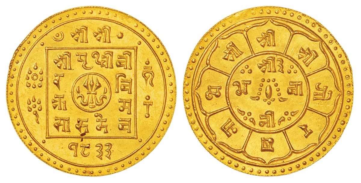 Foreign: Nepal, Prithvi Bir Bikram (1881-1911 AD), gold mohur, SE 1833, KM 673.2, 5.55g. Obv: Legend