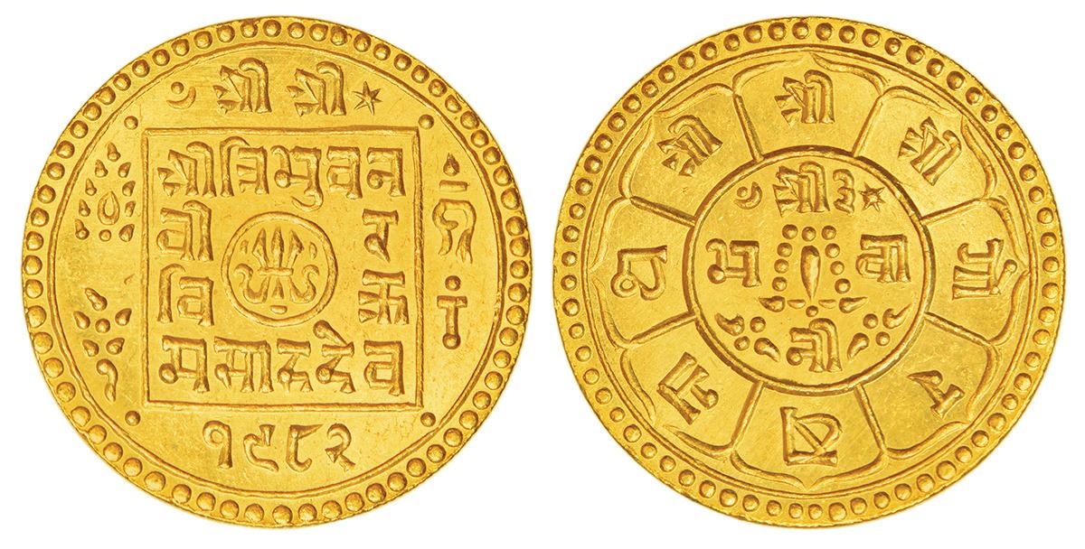 Foreign: Nepal, Tribhuvan Bir Bikram (1911-1950 AD), gold ashraphi, SE 1982, KM 703.1, 12.35g. Obv: Legend Sri Sri Sri Tribhuvan Bir Bikram Shahdev within dotted border with date. Rev: Legend Shree Shree Shree Gorkhanath in segments of outside circle and legend Shree 3 Bhavani in segments within the inner circle.