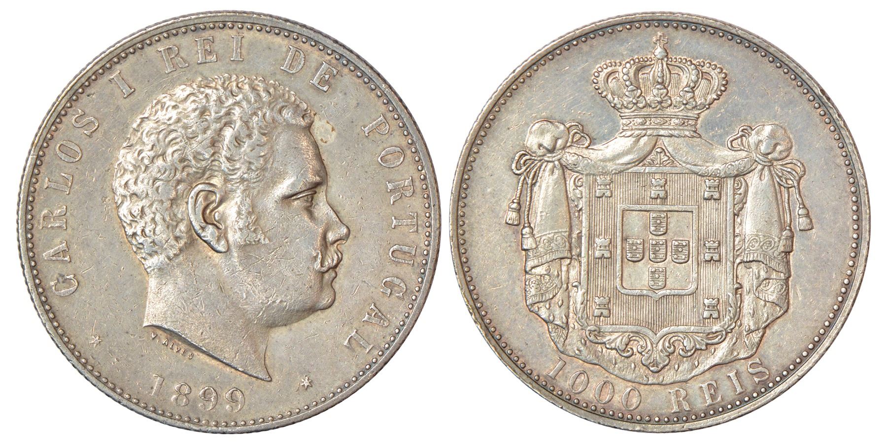 Portugal, Carlos I (1889-1908 AD), silver 1000 reis, 1899, KM 540, 24.93g. Obv: Portrait bust of King. Rev: Crowned mantled arms.