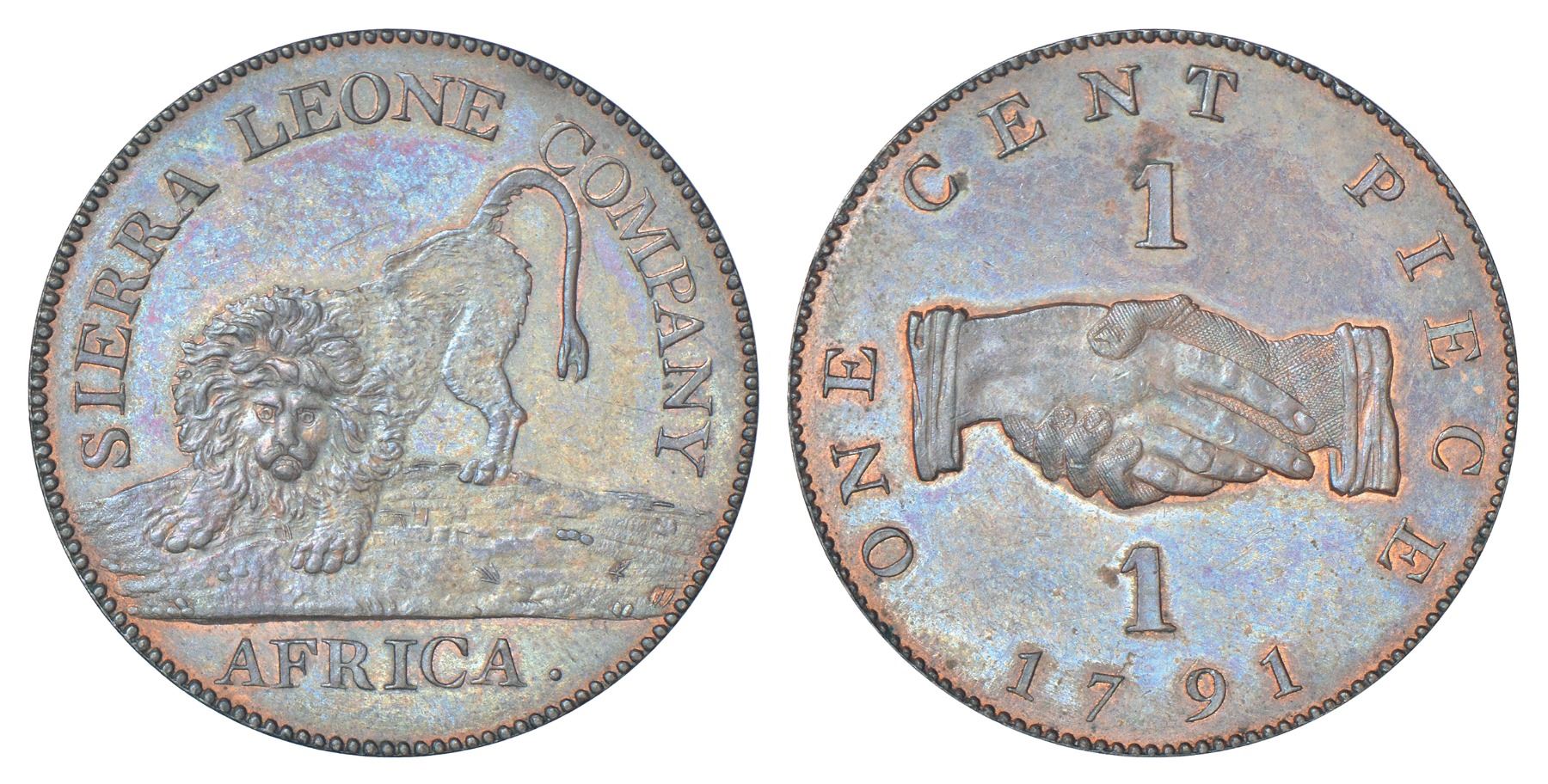 Sierra Leone, Proof, bronze 1 cent, 1791, KM 1, 12.56g. Obv: Crouching lion. Rev: Clasped hand in center, denomination around and date below.